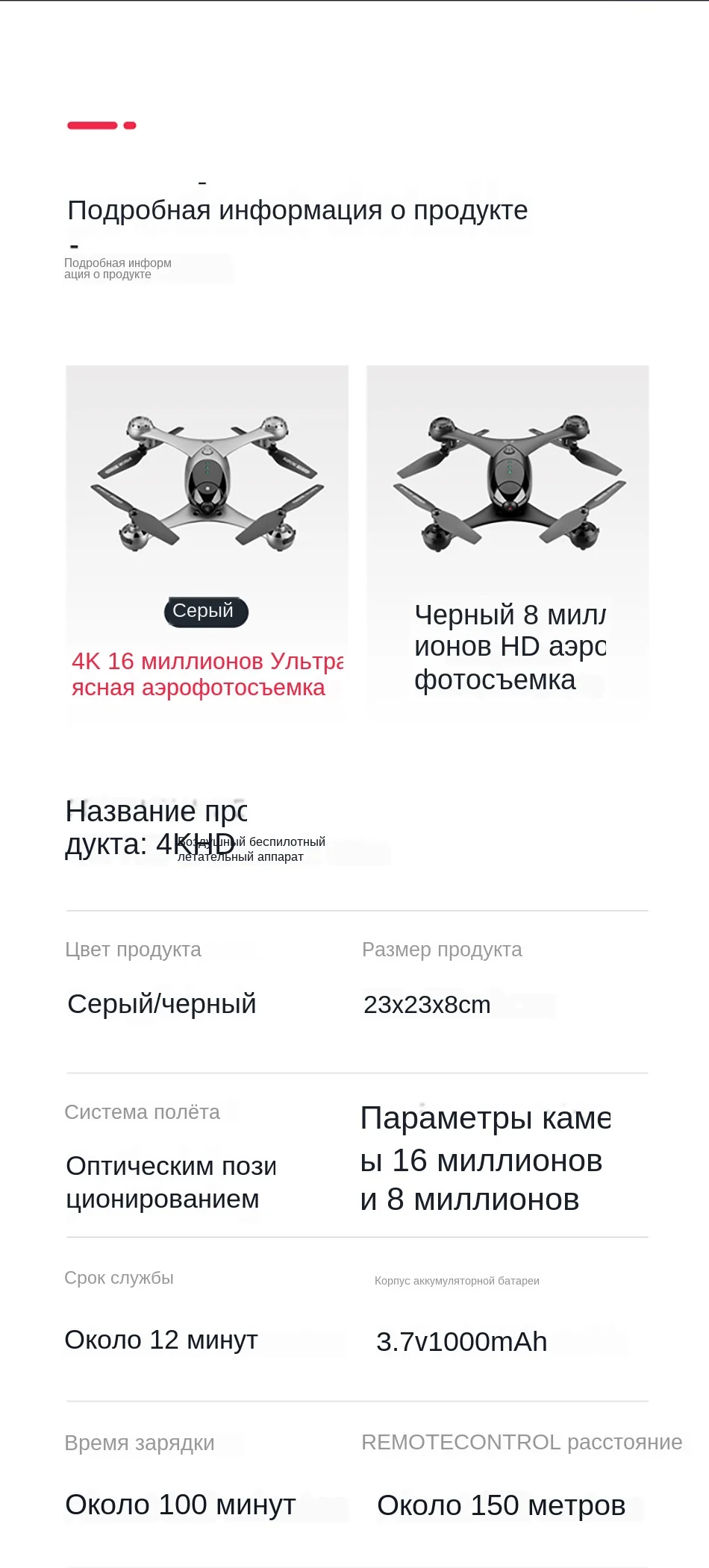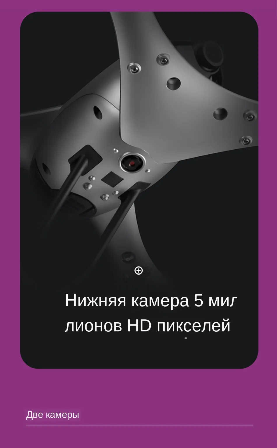 Артикул: Дрон Toytree M6 Частота: 2,4g Канал: 4ch Гироскоп: 6 A Xis Аккумулятор квадрокоптера: 3,7 в 1000 мАч Lipo (входит в комплект) Батарея передатчика: 4 * AAA батареи (не включены) Время зарядки: 90 минут Время полета: 12-15 минут R/C расстояние: 100-150 м Цвет: черный, серый Камера: Двойная камера 1080P (нижняя камера 5 Мп) Двойная камера 4K (нижняя камера 5 Мп) Размер Quad: 27*27*6 см (Защитная крышка)