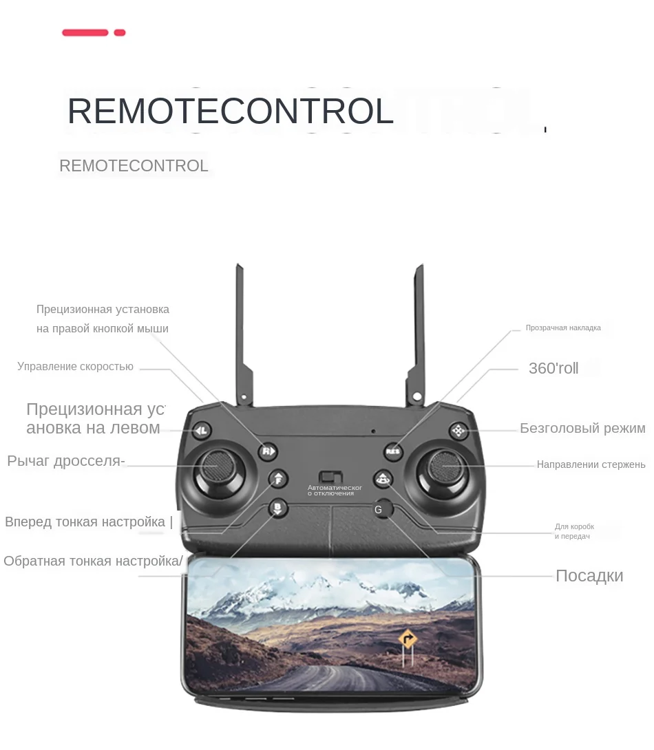 Вверх/вниз, вперед/назад, поворот влево/вправо, поворот влево/вправо, полет в сторону, 3-х уровневый полета Скорость, светодиодный свет, Безголовый режим, автоматический возврат одним нажатием кнопки, удерживатель режима Wi-Fi Fpv, яркий свет, двойная камера