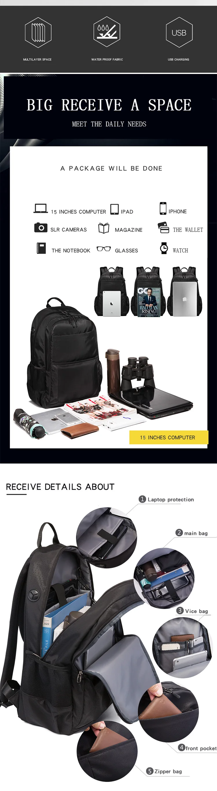 1. Водостойкий материал2. Большое пространство и мульти-карман3. Регулировочная застежка Textture4. Устойчивый к царапинам материал5.USB заряжайте все, что хотите