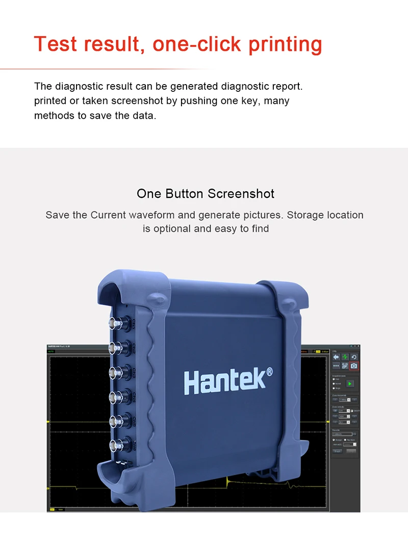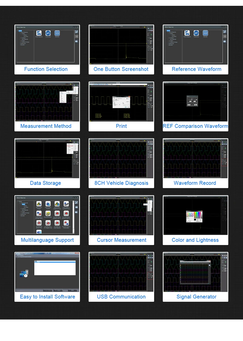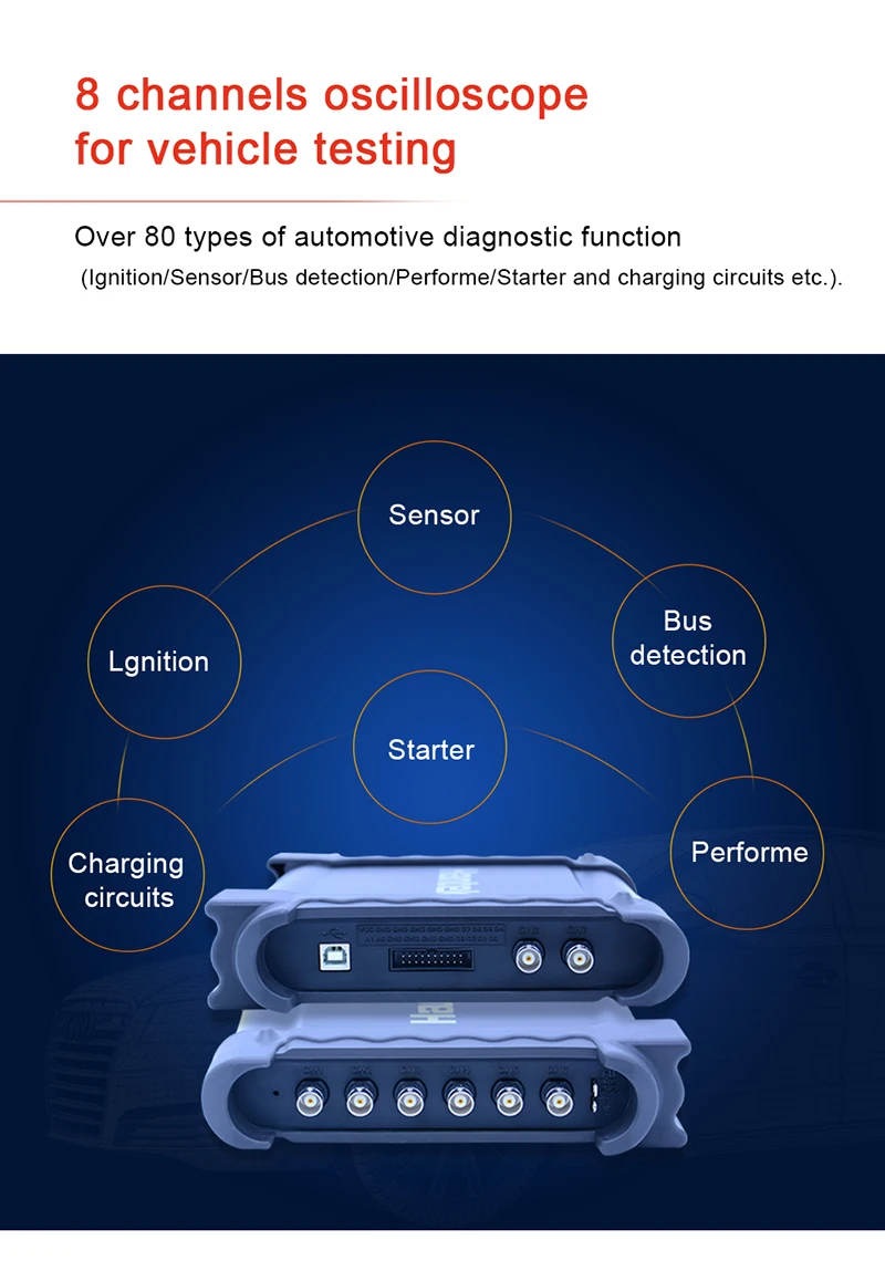 1,8 каналов осциллографа для испытаний транспортных средств. Более 80 типов автомобильной диагностической функции (зажигание/датчик/Обнаружение шины/перфорация/стартер и зарядные цепи и т. д.). 2. Функция помощи видео, предоставляет видео помощь в диагностике, которая может смотреть онлайн, 3. Результаты диагностики могут быть сгенерированы диагностическим отчетом., напечатаны или сняты скриншот нажатием одной кнопки, много методов для сохранения данных. 4. Поддерживается для записи сигнала в течение длительного времени. Он может имитировать распределительный вал и сигнал коленчатого вала. 5. Передавать сигналы через USB 2,0 интерфейс подключи и играй, и нет необходимости дополнительного источника питания; 6. Установите программное обеспечение ПК и начните использовать без каких-либо других драйверов. Поддержка WIN XP/7/8/10.