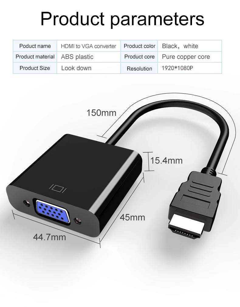 Информация о продукте: Name Название продукта: Удлинительный кабель HDMI M-VGA F Color цвет продукта: черный, белый Packaging Упаковка продукта: упаковка лифта/Полиэтиленовая упаковка Продукт Особенности: Convert конвертировать полный HDMI сигнал в VGA выход Support Поддержка преобразования цифрового сигнала в аналоговый сигнал Support Поддержка HDCP 1,0/1,1/1,2 Quick быстрая установка и простая эксплуатация, установка не требуется Built встроенный чип преобразования, поддержка горячей замены. HDMI формат видеовхода HDMI: 480i / 576i / 480p / 576p / 720p / 1080i / 1080p Format формат видеовыхода VGA: 480i / 576i / 480p / 576p / 720p / 1080i / 1080p Adopt Используйте чип цифрового преобразования, только преобразуйте сигнал HDMI в сигнал VGA, без какой-либо технологической обработки, например, уменьшения и усиления сигнала ◇ Поддержка аудио выход Описание параметров: 1: интерфейс видеовхода-HDMI формат входного сигнала: 720P, 1080I, 1080P 2. Интерфейс видеовыхода-разрешение выхода VGA: зависит от входного сигнала HDMI 3: разрешение поддержки: 800*600, 1024*768, 1280*720, 1280*1024, 1920*1080