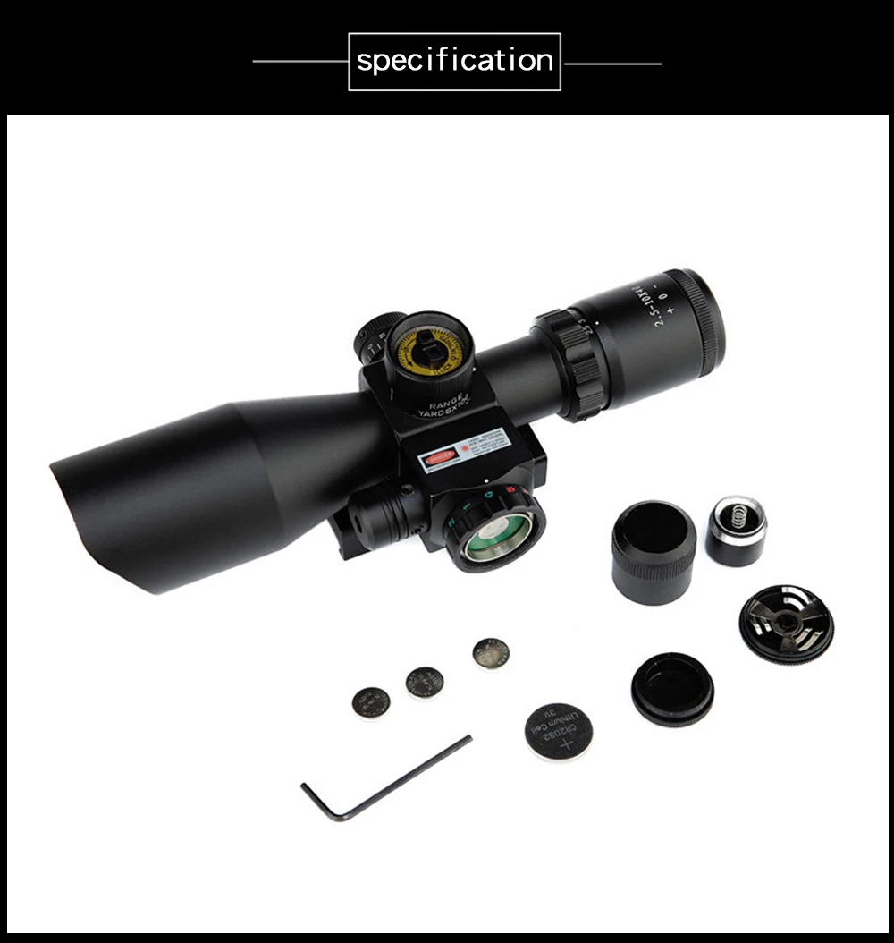 Описание продукта: Увеличение: 2,5-10x Диаметр объектива: 40 мм Сетка: красная/Зеленая Сетка с подсветкой Трубка Диаметр: 25,4 мм Материал: Алюминий из алюминиевого сплава Длина: 198 мм Вес: 532 г Расстояние 100 ярдов, 1 поворот равен 1/4 дюйма Батарея: CR2032,3 в Полностью герметичный и заполненный азотом, ударопрочный, водонепроницаемый и противотуманный