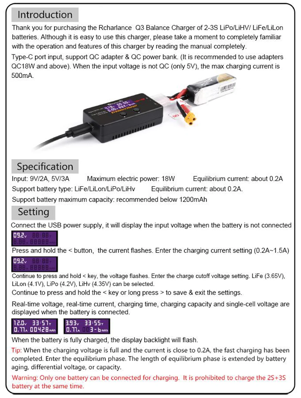 Для зарядки может быть подключен только один аккумулятор. Не заряжайте аккумулятор 2S 3S одновременно!
