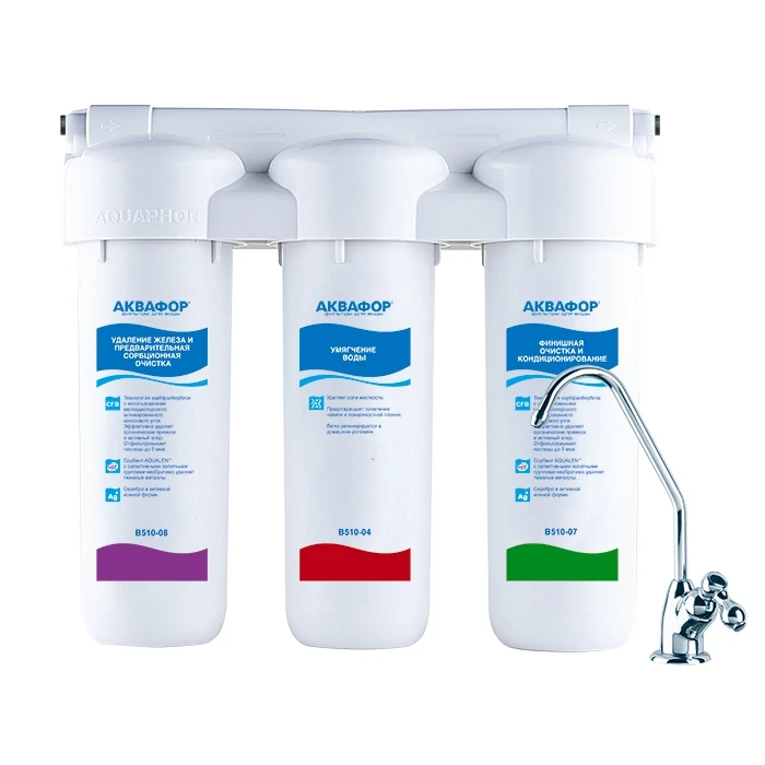 Фильтр для воды Аквафор Трио Fe Н обладает функцией умягчения воды и препятствует образованию накипи.