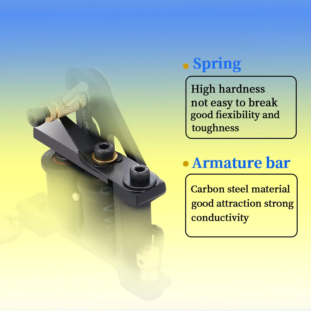 . Материал оправы: чугун . Вкладыш 8 Катушек для обмотки . Начальное напряжение: 4-5 В . Рабочее напряжение: 6- 8 в . Лайнер конденсатор: 33 мкФ 50V . Материал контактного винта: латунь . Скорость бега: 2500-2800р/м . Весна Толщина: 0,5 мм сзади весна и amp; 0,4 мм. Передняя пружина, высокая эластичность и Анти-усталость для длительной работы . Вес нетто: 192 г Тату-машинка Особенности . Ручная Татуировка Машина чугун. Рама: рамка отполирована вручную, прекрасный внешний вид, с использованием технологии CNC, хорошая проводимость, высокая эффективность . Пружина тату-машины: высокая гибкость, высокая эластичность, высокая твердость, не легко разрушить . Контактный винт для тату-машины Sahder: медная палочка легкая проводящая, устойчивая к тупым повреждениям, удобная регулировка . Изготовленная на заказ татуировочная машина Чистая латунь ручная работа Катушка 8 обертка, 28 мм высота, магнитная проницаемость, для обеспечения бесконечной мощности . Машина для татуировки катушки подходит для различных захватов, снимает усталость рук у татуировщиков в более длительном рабочем времени
