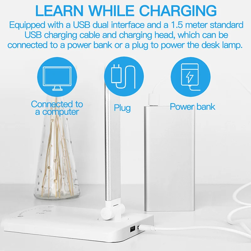 3. Два USB-порта и аккумулятор емкостью 2000 мАч: встроенные 2 USB-порта позволяют держать телефон на полной зарядке во время использования настольной лампы. Встроенная перезаряжаемая литиевая батарея емкостью 2000 мАч, вы можете использовать офисный светильник на 20 часов в режиме ухода за глазами и на 4 часа в режиме 6500K без зарядного устройства. Вы также можете сохранить плагин зарядного устройства для непрерывного использования, он поставляется с USB-кабелем длиной 1,5 м.