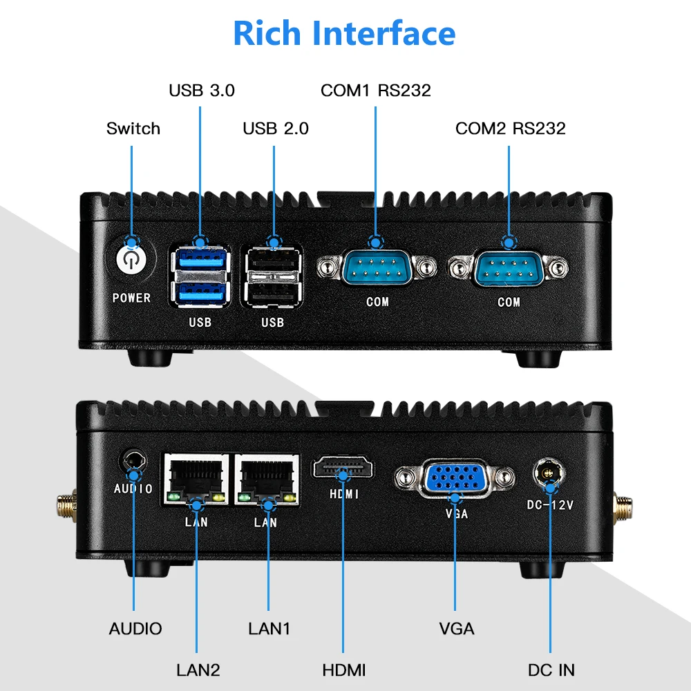 1. На плате с процессорами Intel Celeron, достаточная производительность для ежедневных вычислений, это один высокоэффективный мини-ПК; 2. Поддержка Windows 7/8/10, Linux, Ubuntu OS, Pfsense, Mikrotik ios и многого другого; 3. Поддержка два жесткий диск, one mini SATA SSD и 2,5 дюймов HDD/SSD 4. Ультракомпактный и легкий мини-ПК, Размер 127x136x40 мм и 0,65 кг; 5. Низкое энергопотребление всего 16 Вт, энергосбережение до 90% по сравнению с традиционными настольными компьютерами; 6. Поддержка VESA, установленной на задней стороне монитора, мы бесплатно отправляем Крепление VESA; 7. Поддержка Wake-on-LAN, автоматическое включение при сбое питания, поддержка виртуализации. 8. Широкое подключение, 2x Gigabit LAN, 2x RS232, 2x USB3.0 , 2x USB2.0, комбинированное аудио; 9. Поддержка подключения Wi-Fi к сети; 10. Алюминиевый чехол и пассивное охлаждение без вентилятора обеспечивают бесшумную работу.