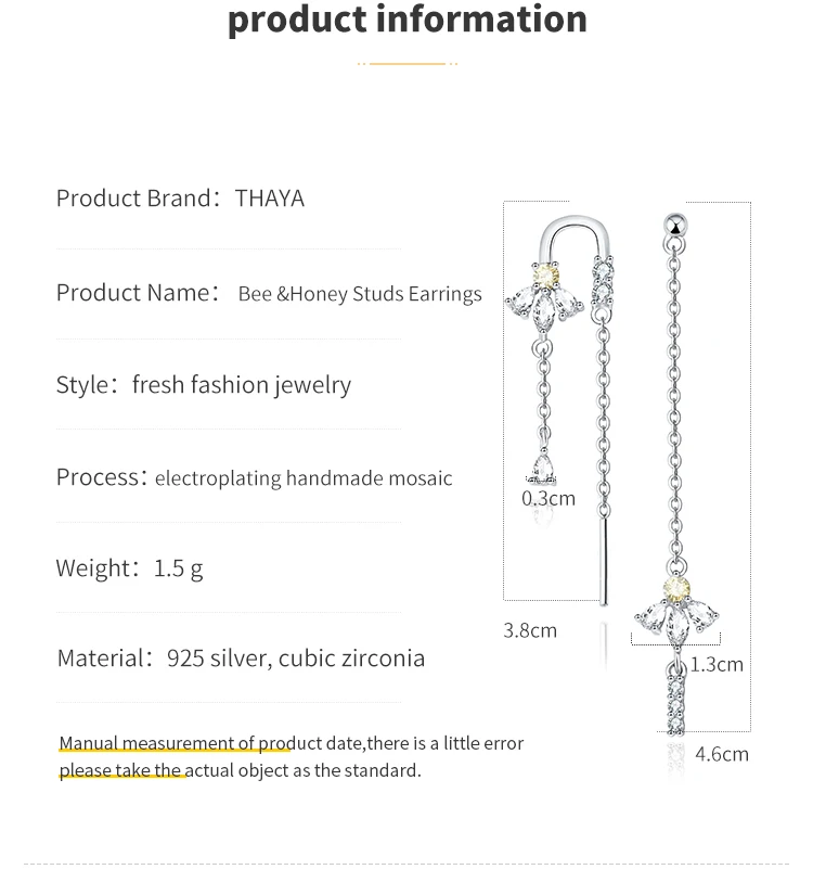 Бренд товара: Thaya Наименование товара: серьги в виде пчелы и меда Материал: серебро 925 пробы, фианит Процесс: ручной работы мозаика Вес: 1,5 г Размер: 3,6 см-4,6 см Стиль: свежий Креативный дизайн