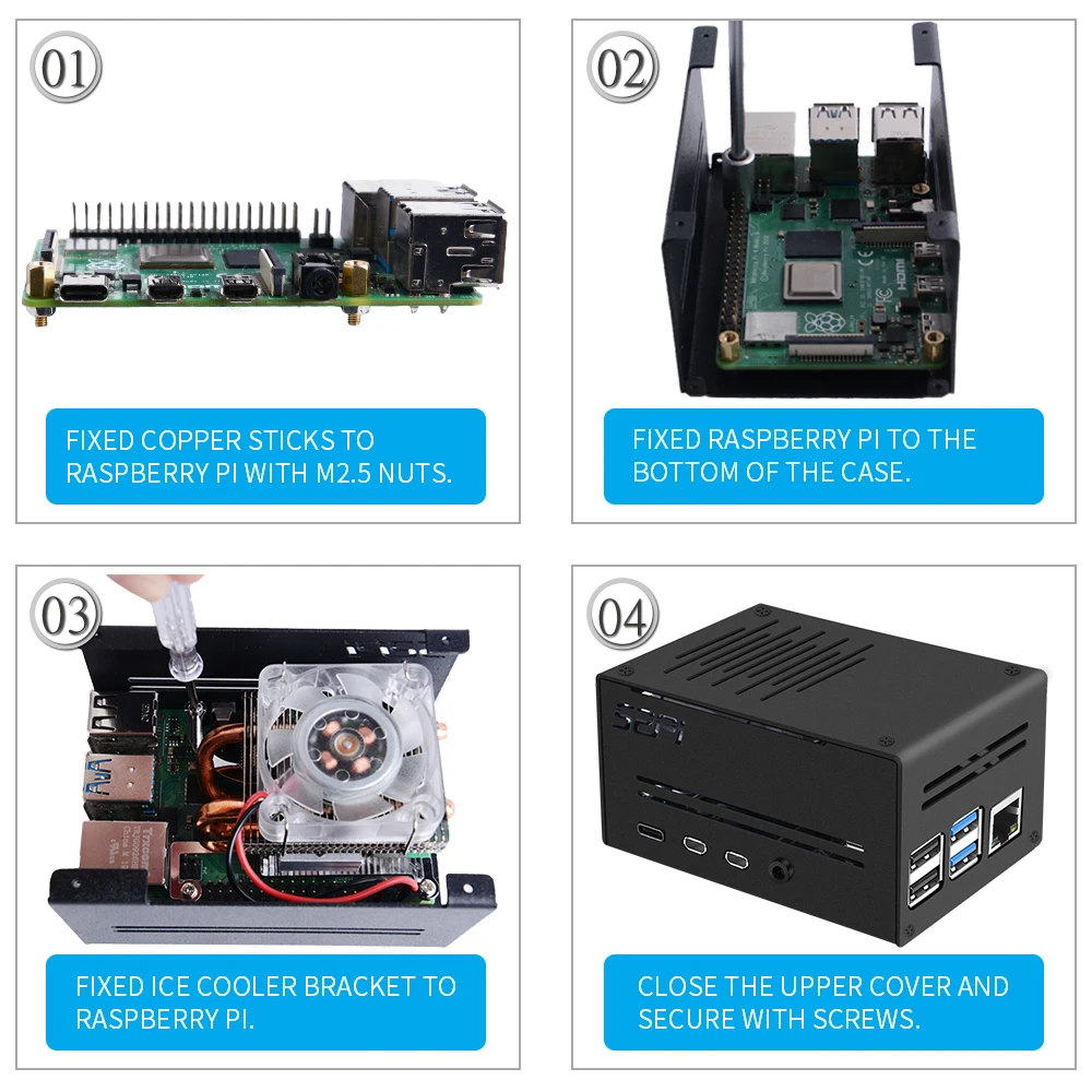 1 x Серебряный охлаждающий вентилятор для ледяной башни 1 х Монтажные кронштейны 3 х термолента 1x1 x акриловая Защитная панель 1 комплект винтов и гаек 1 акриловая Защитная панель 1 x Инструкция Металлический Чехол (только для Pi 4)-1 шт. 1 x CE источник питания для Pi 4 1x4K HDMI-совместимый кабель 1 x sd-карта 128 ГБ 1 х USB SD кард-ридер (Не включает Raspberry Pi)