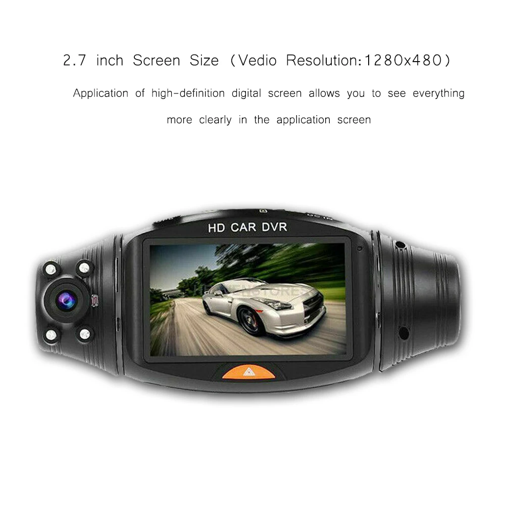 1. Экран: 2,7 дюймов высокой четкости Экран 2. Объектив: f: 2 мм; F, 2,0 (IR Lens) 3. Камера: передняя: 140 градусов широкий угол, задняя: 120 широкий угол 4. Датчик цвета: 1/4 "" Цвет CMOS 5. Разрешение видео: 1280*480 (двойной режим), 640*480 (одиночный режим) 6. Формат видео: AVI Cycled 7. Запись: Да 8. Память: вам нужна карта Micro SD, до 32 Гб (не входит в комплект) 9. Микрофон/динамик: Встроенный 10. Аккумулятор: встроенный литий-полимерный аккумулятор 11. Дополнительный язык: английский/немецкий/японский/русский/традиционный китайский/упрощенный китайский 12. Системные требования: Windows 2000/XP/Vista/Windows 7, MAC OX x выше 10.3.6