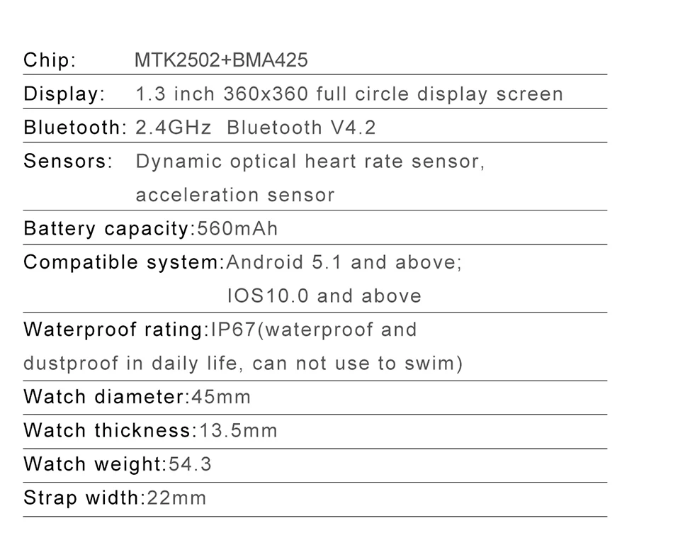 Version A includes: Simplified Chinese (default), EnglishAvailable language of user manual Russian,German,Italian,Japanese,French,Simplified Chinese, English, Spanish.ChipMTK 2502CRAMBuilt-in(cpu):RAM:32MB ROM32MB Extended SPI:128MBSensorGsensorHeart rate sensorZhanhengGPSNoBluetooth4.0+3.0WaterproofIP68CraftsmanshipZinc alloy + PC plasticProduct weight31gScreen size1.3 round screenScreen Resolution360*360Screen type LTPS LCD screenScreen material Tempered glassProduct adjustable minimum inner diameter32mmProduct adjustable maximum inner diameter65mmApplicable wrist circumference range35~60mmTotal length of wristband255mmWristband material Leather, (Extra gift silicone strap)Package dimensionsTotal weight