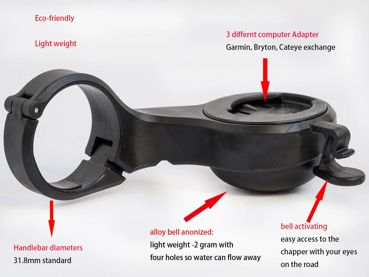 Экологически чистый, без колокольчиков аккумулятор Звонок активации: легкий доступ к чаппер с глазами на дороге Сплав колокольчика: Возьмите-2 грамма с четырьмя отверстиями, чтобы вода могла течь далеко Интегрированный gar-mi-n, bryton, компьютерный кошачий глаз почти вся модель велосипедного компьютера. С монтажом gopro, светильник в сборе. 4 в 1 дизайн экономит деньги