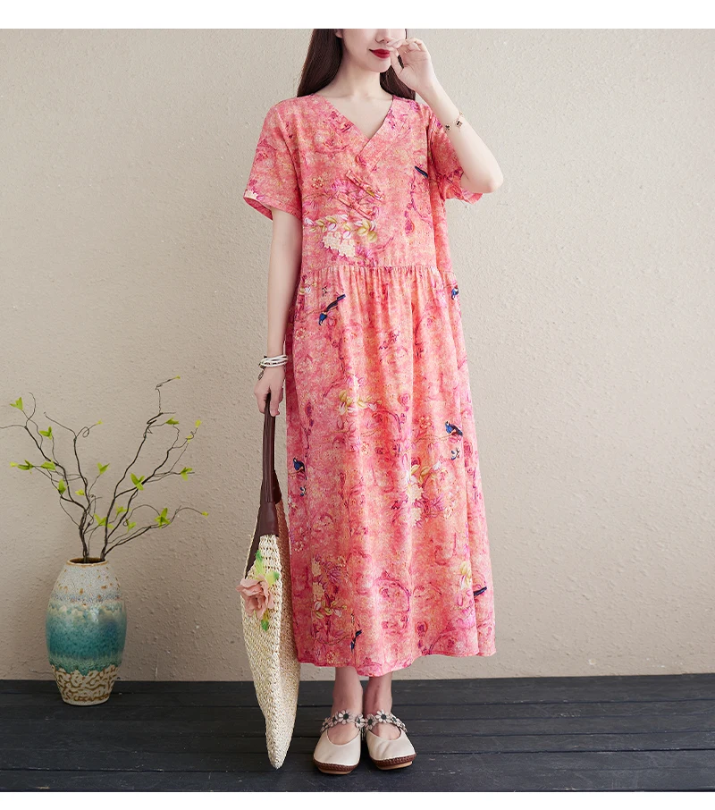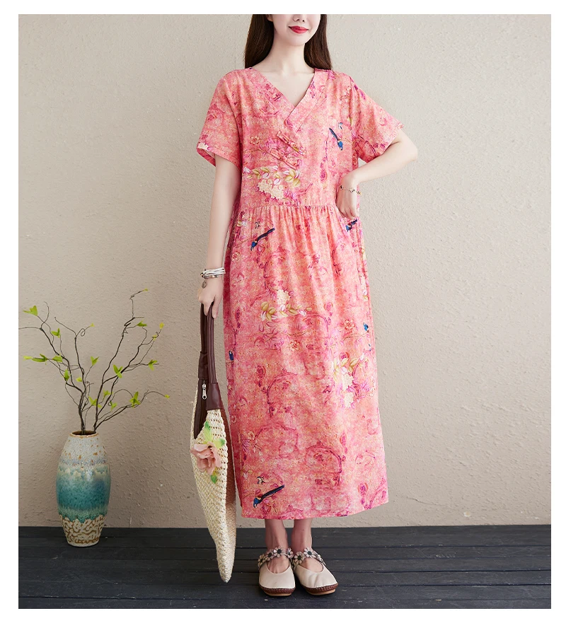 Летнее народное хлопковое льняное платье, повседневное свободное женское платье большого размера с v-образным вырезом, длинное платье с цветочным принтом Sukienki