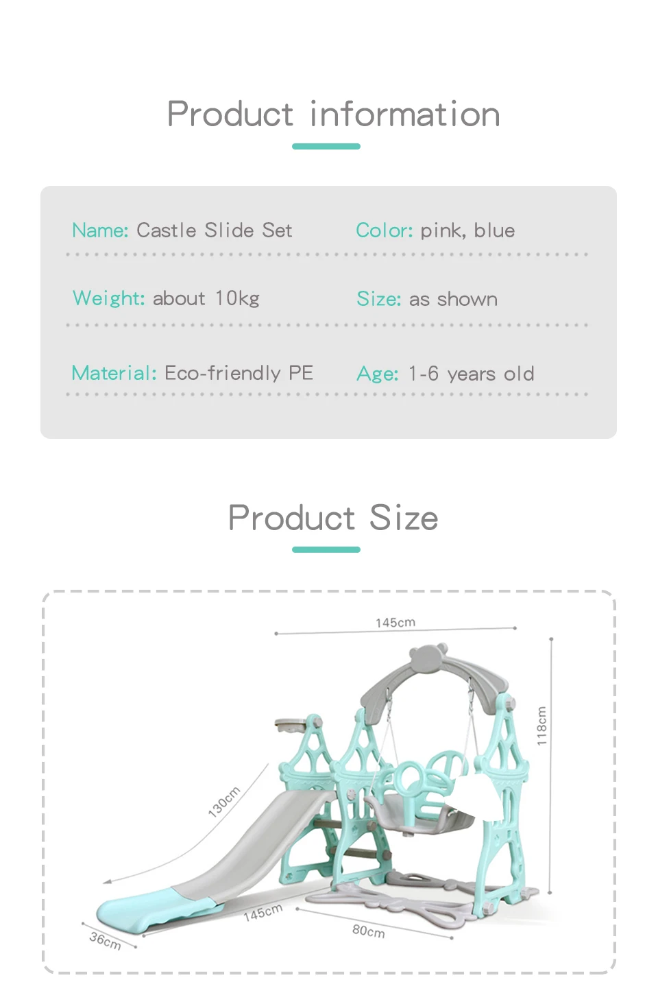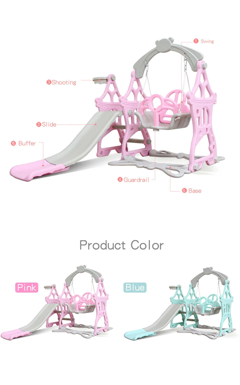 Информация о товаре: Наименование: замок 3 в 1 Набор горки и качели Размер: как на изображении Вес: около 10 кг/22 фунта Цвет: розовый, синий Материал: экологически чистый ПЭ Возраст: 1-6 лет 【 Функции 3 в 1 】-Этот яркий и красочный игровой набор 3 в 1 имеет 3 функции: полированная горка, крепкие качели и баскетбольный обруч, который предназначен для семейного и наружного использования. Все элементы деятельности подходят для малышей [Безопасность и нетоксичность]-этот игровой набор 3 в 1 изготовлен из прочного и нетоксичного материала HDPE, соответствует американскому стандарту игрушек. Проверено на безопасность. Горка выдерживает вес 132 фунтов, поэтому ваши дети могут скользить. Он может сопровождать вашего ребенка до взросления.
