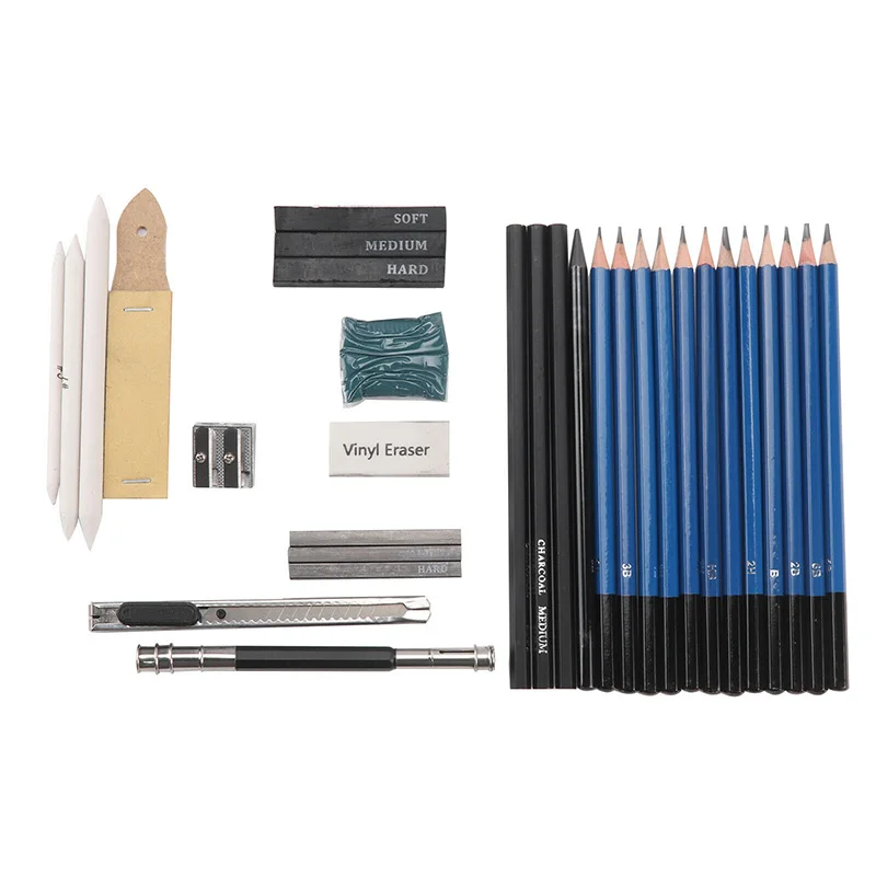 С различными карандашами для набросков (12 шт.): B/2B/3B/4B/5B/6B/8B/HB/2H/3H/4H/5H, для нанесения теней и светильник.