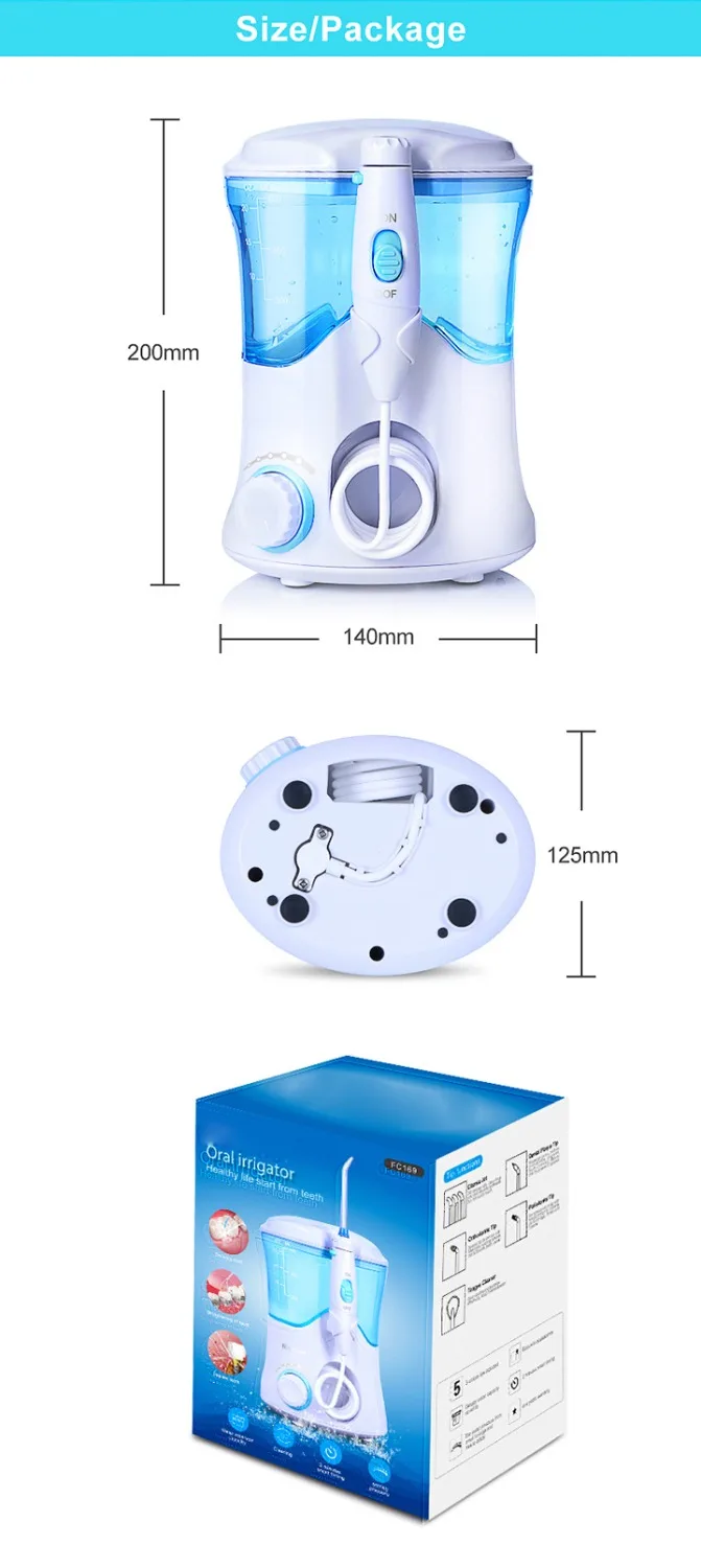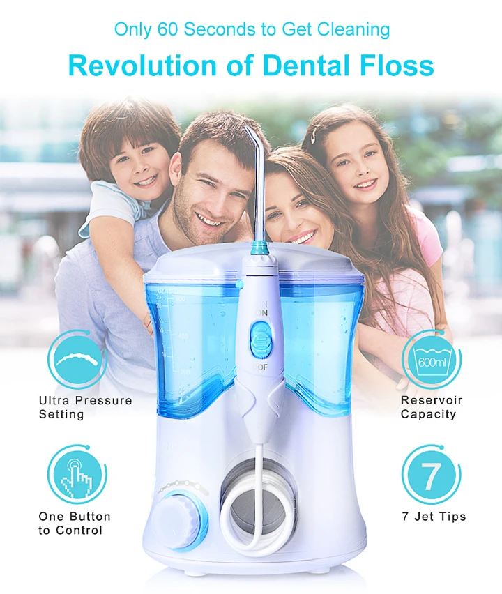 Вращение зубной нити всего 60 секунд для очистки 1: установка сверхвысокого давления 2: Емкость резервуара 3: одна кнопка для управления 4:7 струйных наконечников