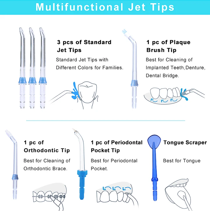 Многофункциональные струйные наконечники 3 шт стандартных струйных наконечников-Стандартные струйные наконечники разных цветов для семей. 1 шт. зубных щеток-лучше всего подходит для очистки имплантированных зубов, протезов, стоматологический мост 1 шт. ортодонтических наконечников-лучше всего подходит для очистки ортодонтического бандажа 1 шт. карманных наконечников для пародонта-лучший скребок для карманного языка-лучший для языка