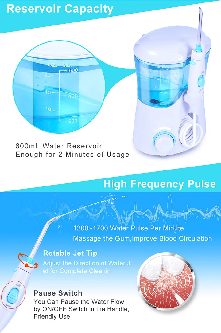 Емкость резервуара 600 мл воды достаточно для 2 минут использования высокочастотного импульса 1200-1700 водяной пульс в минуту сообщение десен, улучшите циркуляцию крови ротационный струйный наконечник Регулируемое направление струи воды для полной очистки выключатель паузы вы можете приостановить поток воды вкл/выкл переключатель в ручке, дружественное использование