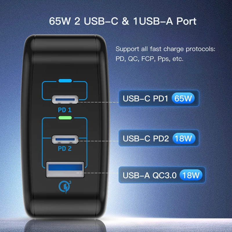 1,1 это зарядное устройство с 3 usb-портами для путешествия зарядное устройство с общей мощностью 65 Вт, USB-A: 18 Вт QC, Тип C2: 18 Вт PD, Тип C1: 65 Вт PD. Он также имеет функцию защиты, такую как защита от короткого замыкания, защита от перенапряжения и защита от перегрузки по току, отвечает требованиям RoHS.