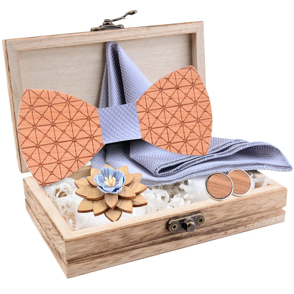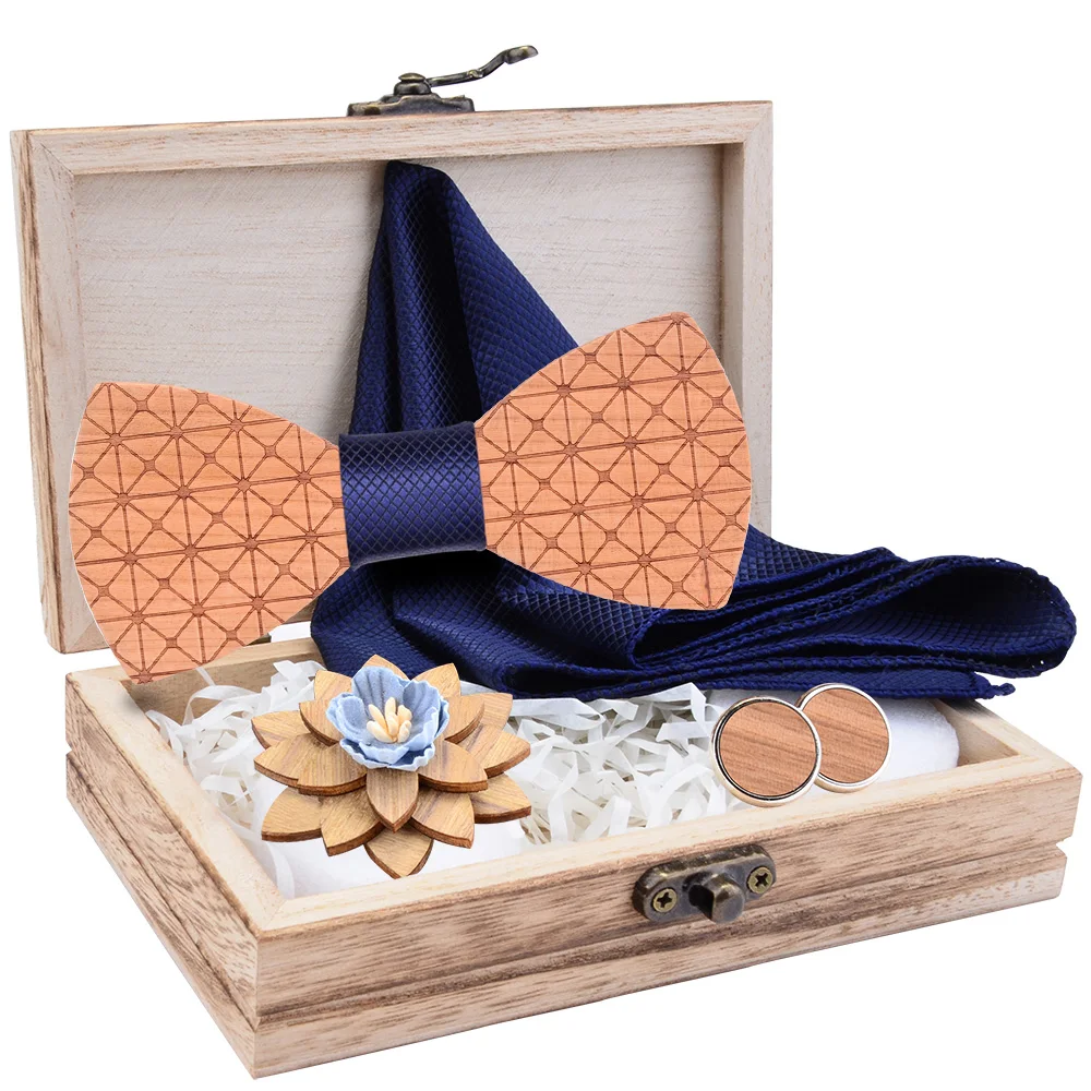 Размер бабочки: 12 см * 5 см Размер носового платка: 22 см * 22 см Включает: деревянная бабочка, Hanky, запонки и брошь Посылка: деревянная подарочная коробка Имейте Factroy: Да Оптовая скидка: Да Пользовательская этикетка: Да Легко сочетать Вечерние