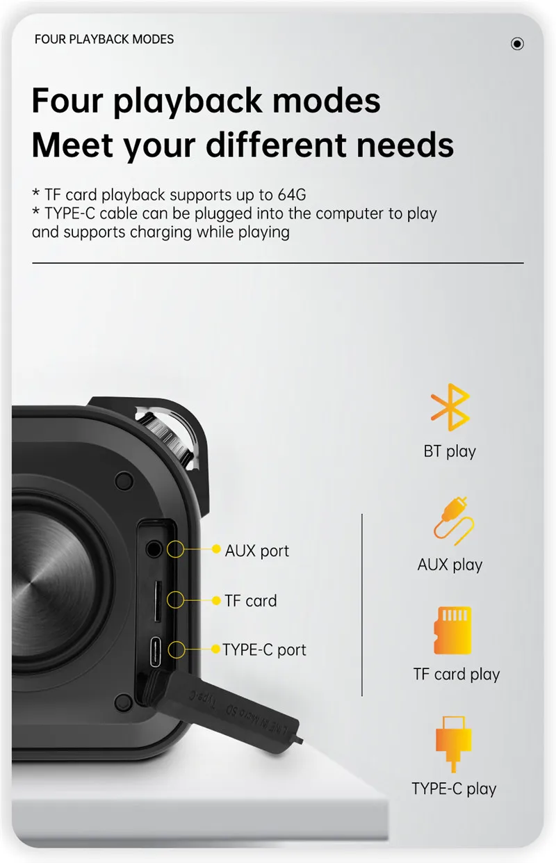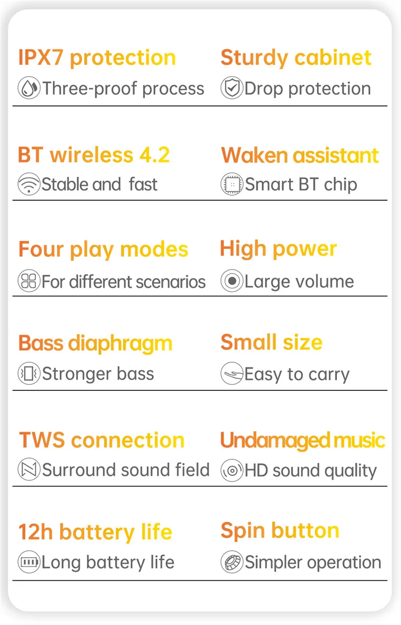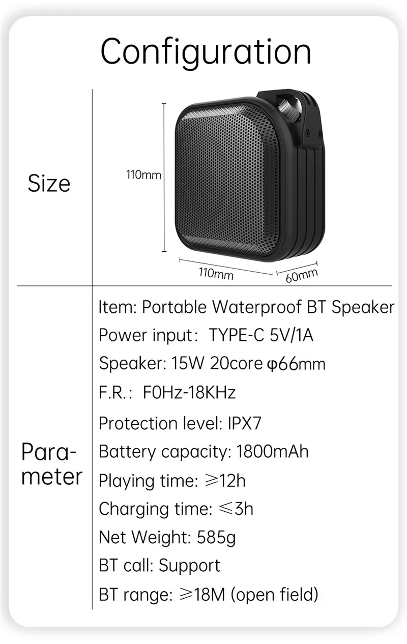 Технические характеристики: Версия Bluetooth: 4,2 + EDR Пиковая мощность: 15 Вт Время работы: ≤ 12 часов (средний объем) Входная мощность: 5 в пост. Тока/1 А Время зарядки: ≤ 3 часа Диапазон подключения Bluetooth: ≤ 18 метров Размер динамика: 66 мм Батарея Емкость: 3,7 V/1800 мА/ч, Батарея Сигнал предупреждения о низком заряде батареи: 3,3 V Микрофон: вызов Bluetooth Искажения: ≤ 1.0% Ток выключения: ≤ 40uA Особенности: 1. Используйте динамик 15 Вт + 1 внешнюю вибрационную мембрану, периферийную железную сетку и силикон. Водонепроницаемость: IPX7. Встроенная звуковая технология MaxxAudio DSP. 2. Используйте 4,2 модуль Bluetooth, быструю пару. Устойчивость сигнала, защита от помех, низкое энергорасход и длительное воспроизведение. С микрофоном и поддержкой функции вызова, поддержка TWS для беспроводной стереозвука. 3. Встроенный 3,7 V 1800mA батарея, ≥ 12 часов время работы при прослушивании (@ 65dB SPL середине громкости), 3ч при полной зарядке. В верхней части находится 6 кнопок: питание, режим, воспроизведение/пауза, V-/Prev, V +/Next 4. Динамик с TF и Тип-C и 3,5 AUX вход portsinterfaces на спине. Tf-карта поддерживает формат WAV/FLAC/APE/MP3 для воспроизведения музыки. Интерфейс Type-C поддерживает входную зарядку 5 В/1 а постоянного тока и умное Определение напряжения зарядки. 5. Два года гарантии и пожизненная техническая поддержка. Это абсолютно 100% без беспокойства.