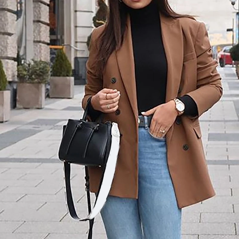 Модное женское пальто коричневого цвета с длинным рукавом и отложным воротником, костюм куртки больших размеров, элегантная женская офисная верхняя одежда на пуговицах, коричневые свободные топы