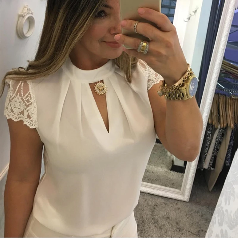 S-5XL Женская одежда, шифоновая блузка с кружевным рукавом, женские корейские рубашки, женские блузы, топ, белая блузка, открытые сексуальные топы