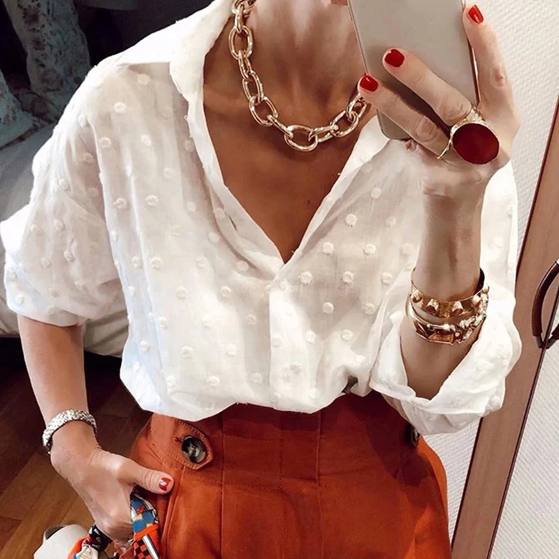 Хит продаж, модные рубашки в горошек, женские сексуальные полупрозрачные топы, OL, женские шифоновые блузки, черный, белый, прозрачный топ, женские блузы