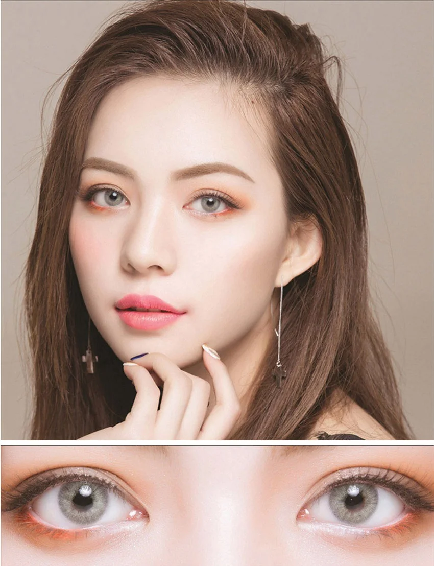 Серые линзы будут отображаться желтым, когда не носите. Цвет вашего зрачка повлияет на это, когда вы его носите.