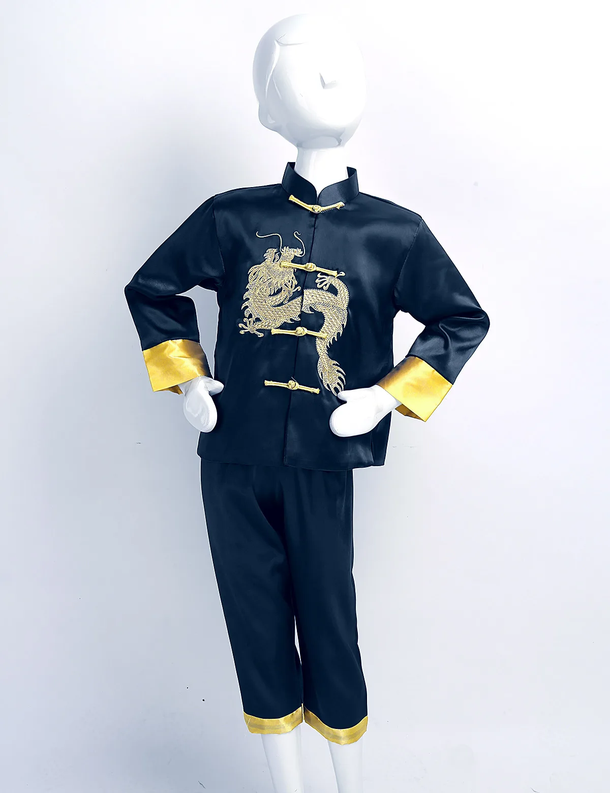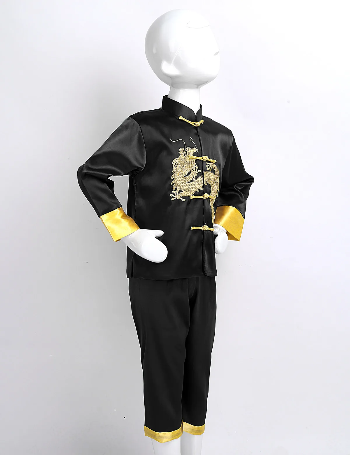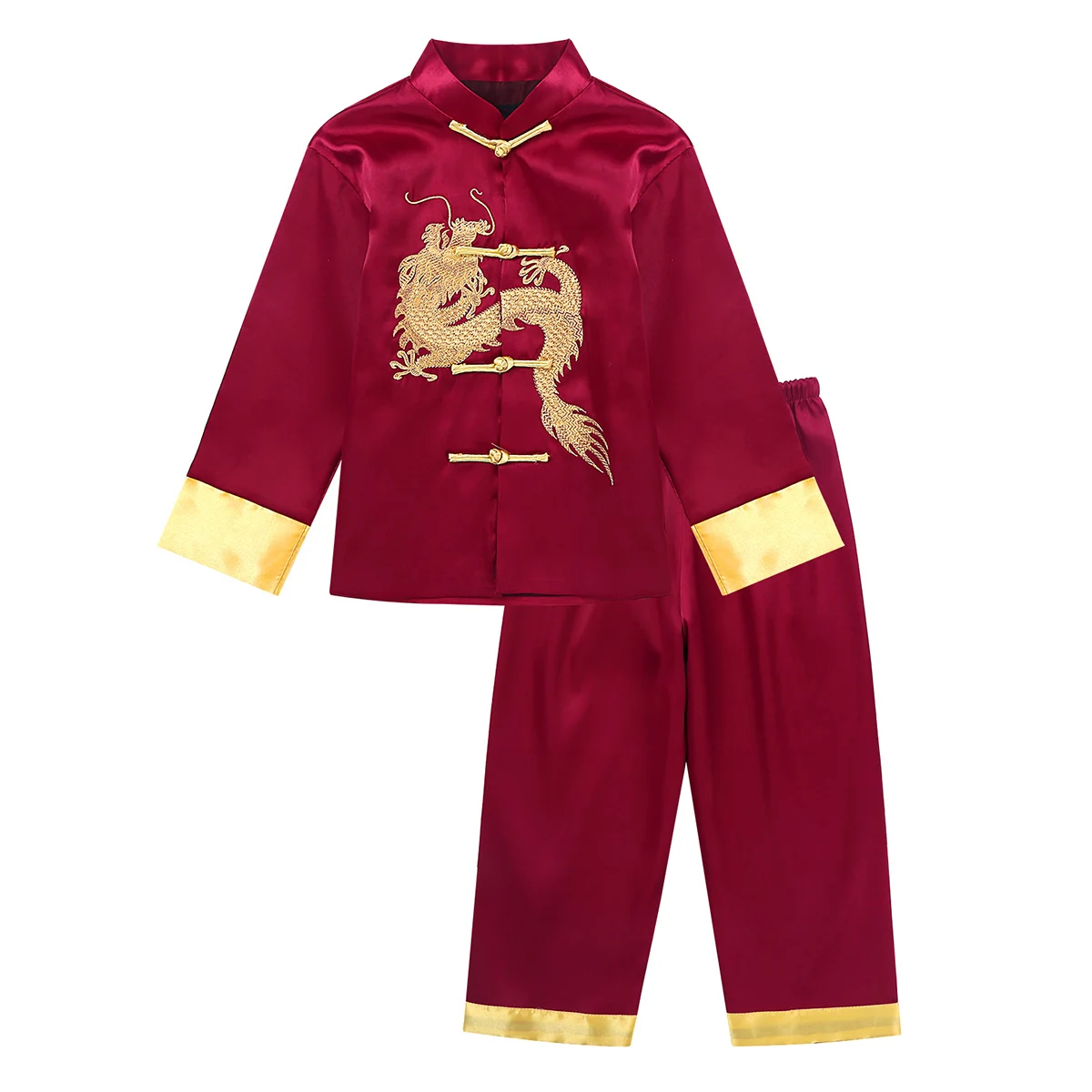 Подходящие брюки с удобным эластичным поясом. Высококачественный шелковый атлас, приятный для кожи, очень мягкий, гладкий и удобный в носке. Классный китайский костюм дракона для вашего мальчика.