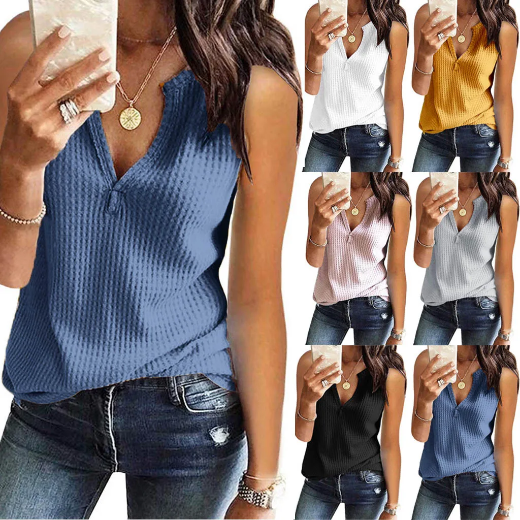 Женская мода v-образным вырезом рубашки без рукавов Твердые вафельные трикотажные свободные облегающие футболки топы