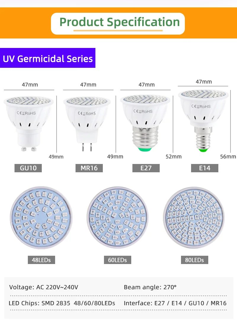 Лампа-стерилизатор для УФ-дезинфекции Kaguyahime E27 MR16, лампа UVC, ультрафиолетовая озоновая бактерицидная лампа для дезинфекции