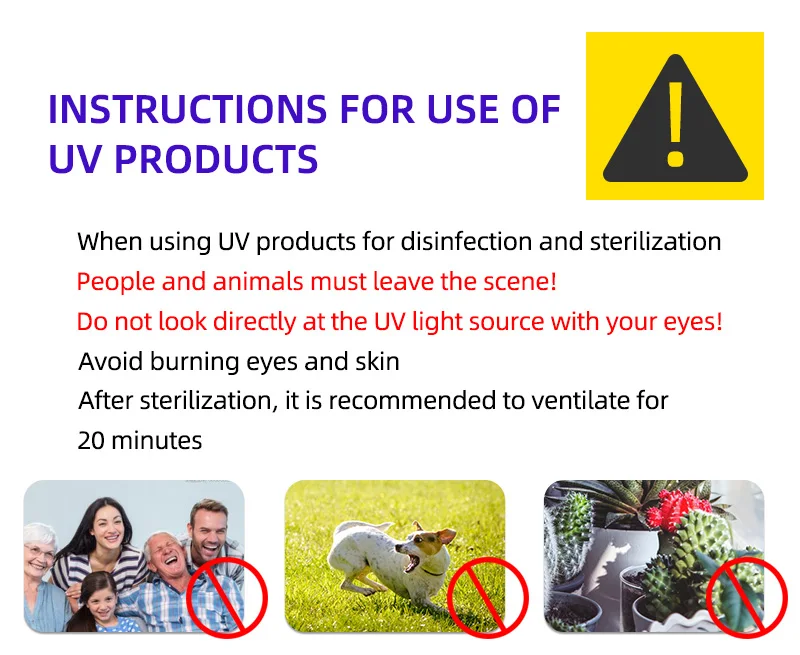 1.UVC лучи вредны для глаз и кожи, поэтому, когда лампа включена, не смотрите прямо на лампу. Когда свет работает, люди/Домашние животные/растения должны оставить комнату.
