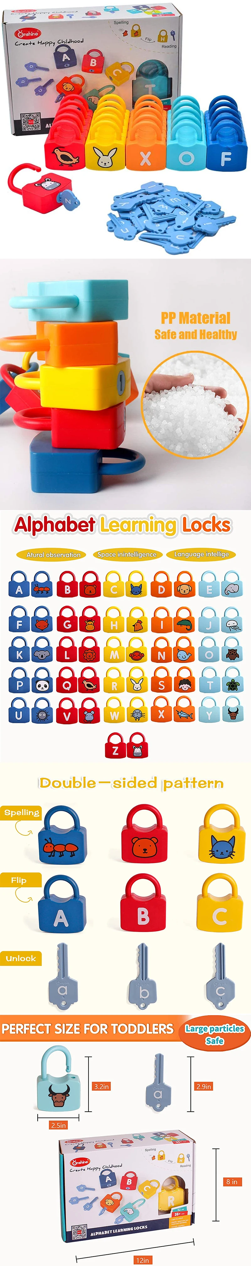 26 замков имеют узор с одной стороны, 26 прописных букв с другой, 26 строчных букв на 26 клавишах Это Обучающие замки с алфавитом, специально разработанные для детей для распознавания и изучения букв. Рисунок яркий и четкий. Ключ, соответствующий строчной букве, может открыть замок соответствующей верхней буквы. Пусть дети быстро находят сходства и различия между 26 прописными и строчными буквами, а также углубляют их обучение и память. Эти красивые замки и ключи могут стимулировать любопытство детей. Во время процесса разблокировки дети будут изучать цифры, цвета, улучшать координацию рук и глаз, мелкую моторику и расширять свои классификации и способности к обучению. Гладкая кромка не имеет грубых краев или заусенцев, а материал безопасен и безвкусный, поэтому он достаточно безопасен для детей. В дополнение к использованию в качестве детских игрушек, он также может использоваться в качестве украшения для домов, детских садов и офисов. Поэтому он является идеальным подарком для семьи и друзей на праздники и юбилеи.