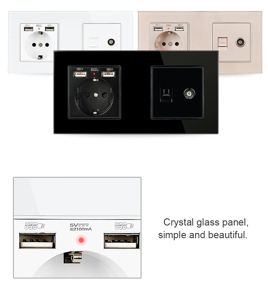 UNKAS Хрустальная стеклянная панель стандарт ЕС электрическая розетка двойной USB порт + женский ТВ разъем CAT5E RJ45 интернет компьютер данных