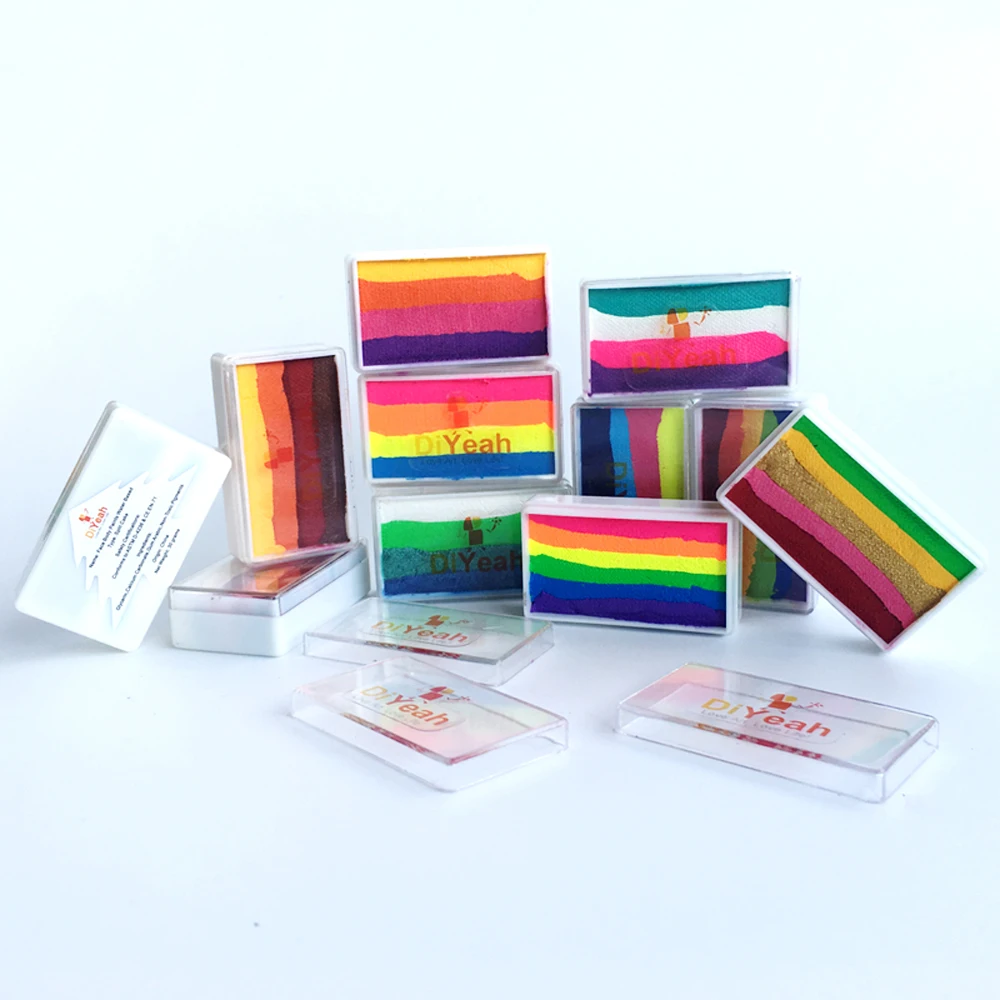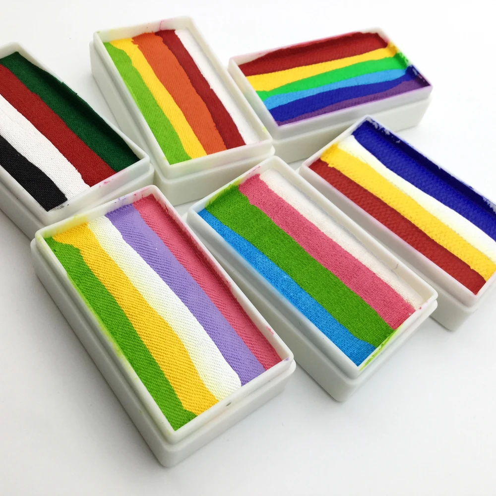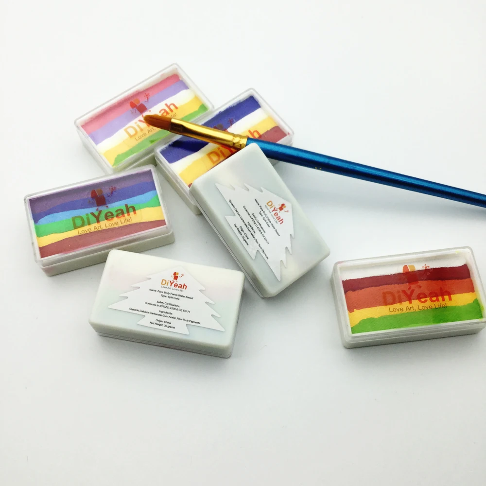 * Сертификат безопасности: соответствует стандарту ASTM США, европейскому стандарту CE EN-71. Безопасный и нетоксичный. * Тип: на водной основе * Размер: 5,3 х3 х1,6 см * Вес нетто: 30 г/шт. * Посылка: 1 шт. радужной краски для лица * Как использовать: окуните кисти и губки в воду, а затем используйте влажные кисти и губки, чтобы получить краски, а затем накрасьте на лицо и тело. * Как чистить: протрите влажной бумагой или постирайте с мылом и гелем для ванны. * Ингредиенты: глицерин, карбонат кальция, резинки, арабские, нетоксичные пигменты.