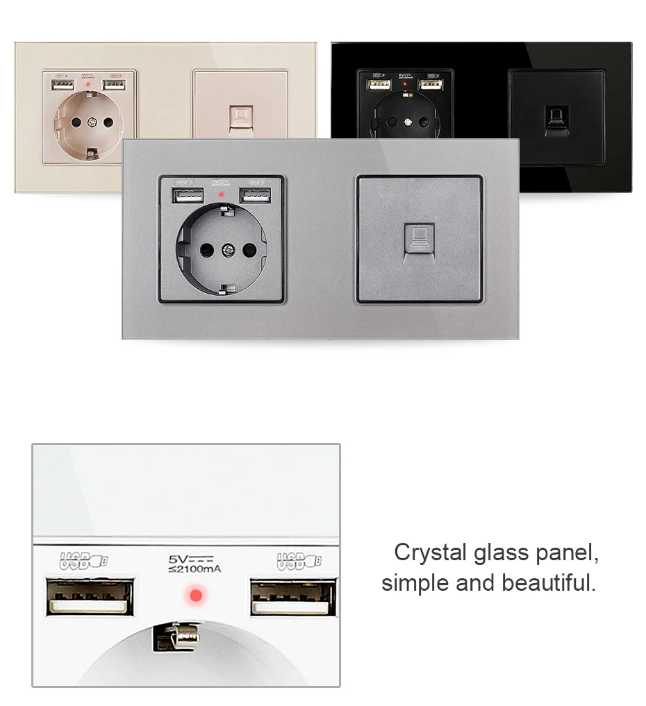 UNKAS электрическая розетка со стеклянной панелью европейского стандарта с 2 USB + 1 Gang RJ45 Интернет-разъем CAT5E Разъем 172*86 мм