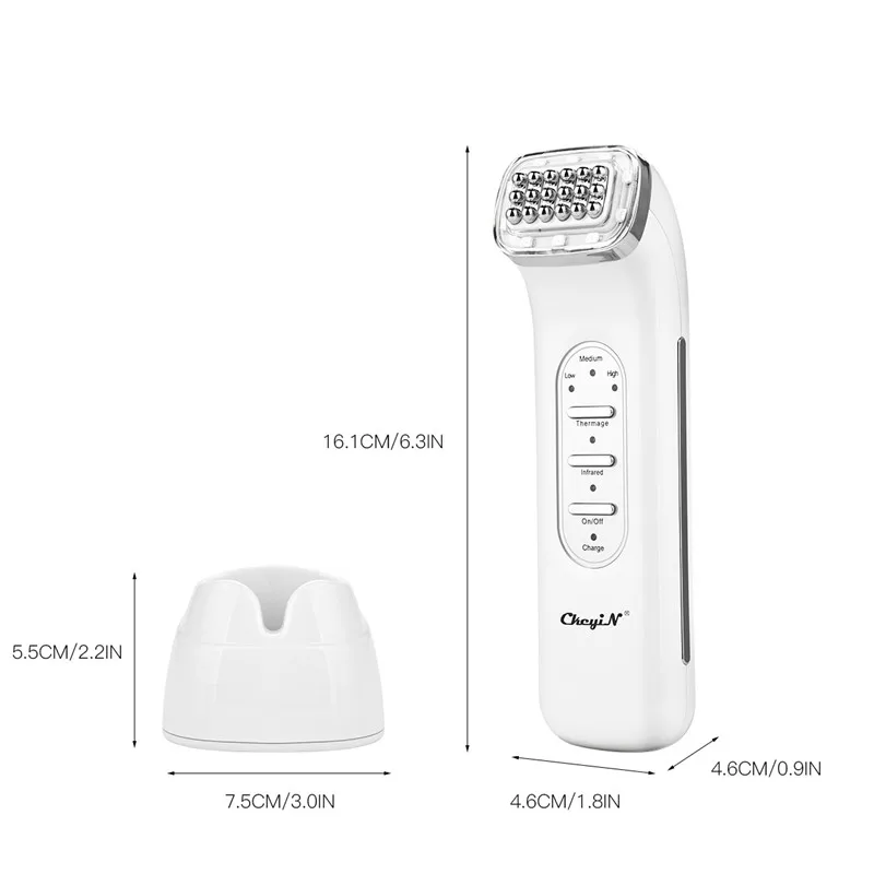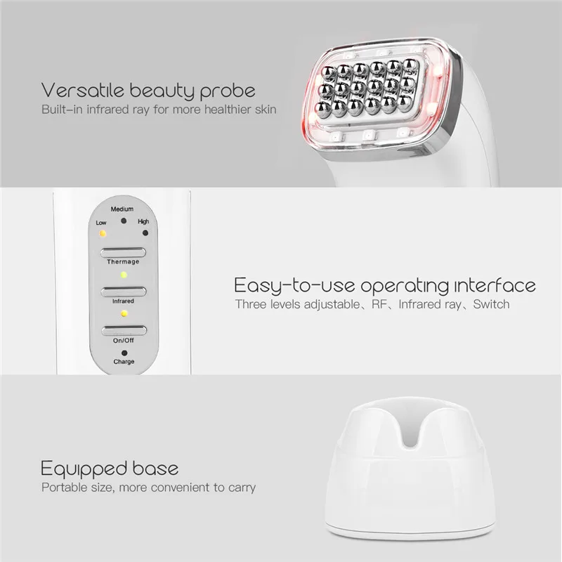 Эргономичный дизайн, легко держать и использовать; Простой в использовании, но интуитивно понятный интерфейс управления, более удобно. Мощная аккумуляторная батарея обеспечивает до 4 часов беспроводного эффективного использования. Многофункциональное косметическое устройство сливается с радиочастотной технологией и инфракрасной терапией для решения всех проблем с кожей и приносит много преимуществ на вашем лице. Она начинает работать только тогда, когда Массажная головка касается кожи, более безопасная и надежная. Он также запрограммирован с функцией синхронизации 10 минут, добавляет безопасности. Технология RF: она разработана с низкой, средней и высокой интенсивностью тока, работает через радиоволновые токи, которые проникают вглубь дермы и подкожных слоев кожи, которые, наконец, разогреваются для стимуляции производства коллагена, ускорения обмена веществ, уменьшения морщин и подтягивания и упругости кожи. Инфракрасная терапия: инфракрасное излучение проникает в кожу и генерирует тепловую энергию для активации клеток, улучшения кровообращения и обмена веществ, а также поддержания здоровья и упругости кожи.