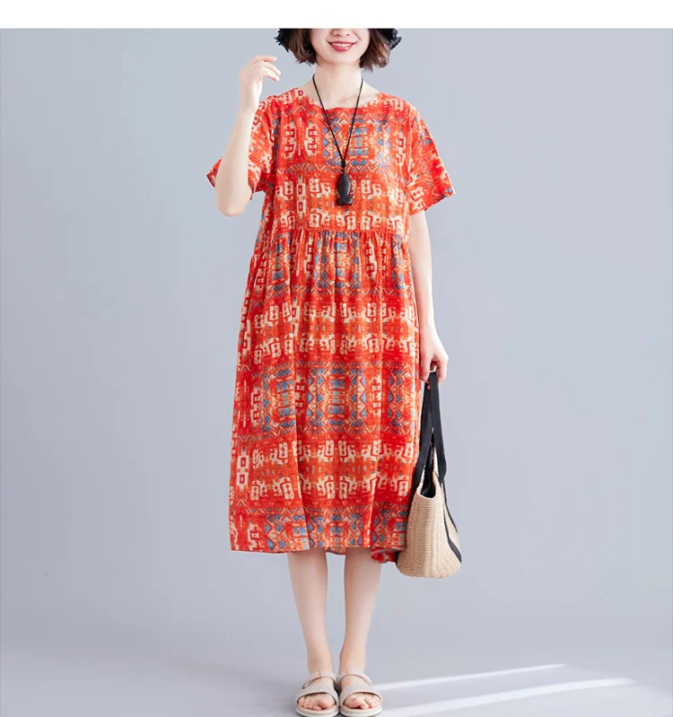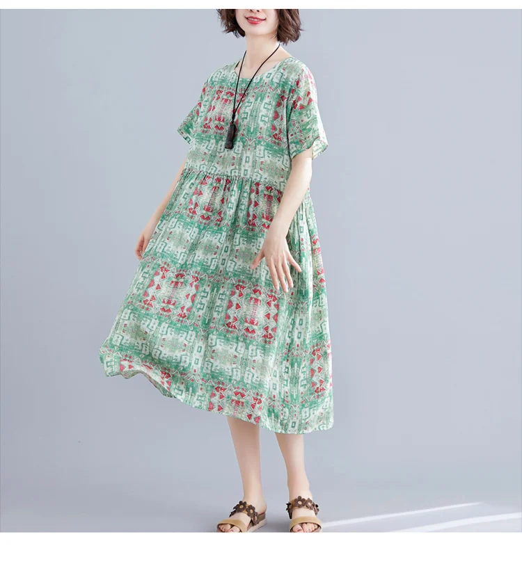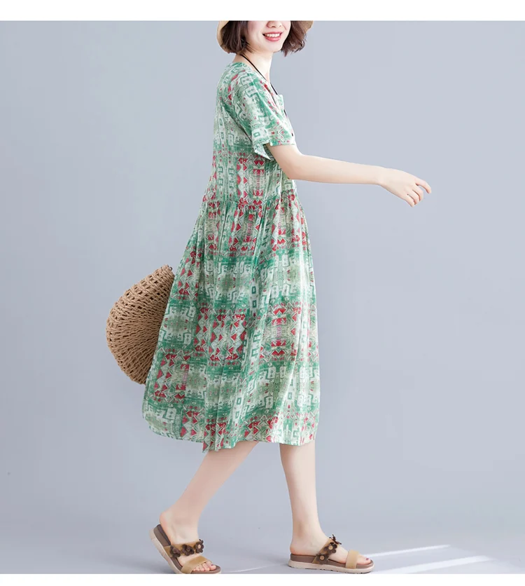 2021 Новое летнее платье граффити винтажное хлопковое льняное платье с коротким рукавом и круглым вырезом повседневное свободное платье миди для женщин Robe Femme