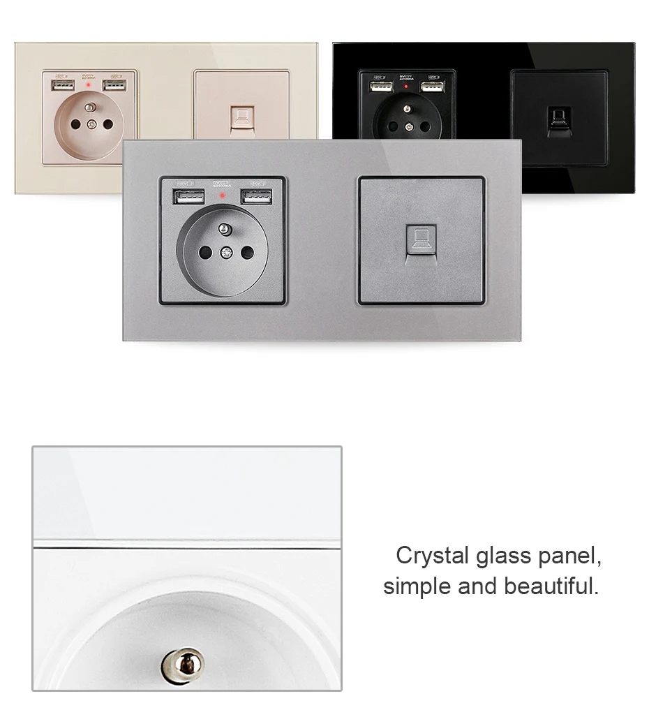 Настенная розетка UNKAS, серая стеклянная панель, французская стандартная с 2 USB-портами для зарядки и коннектором RJ45 для интернет-компьютера, серого цвета