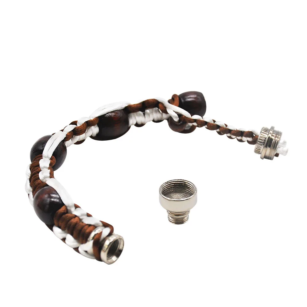 Материал: высококачественный металл, веревка и дерево Длина: 260 мм/10,24 дюйма Диаметр металлической чаши: 15 мм/0,59 дюйма Цвет: черный/белый/красный/коричневый (4 вида цветов полностью) Вес нетто: 32 г/шт. Использование: для курения табака Дизайн: браслет курительная трубка