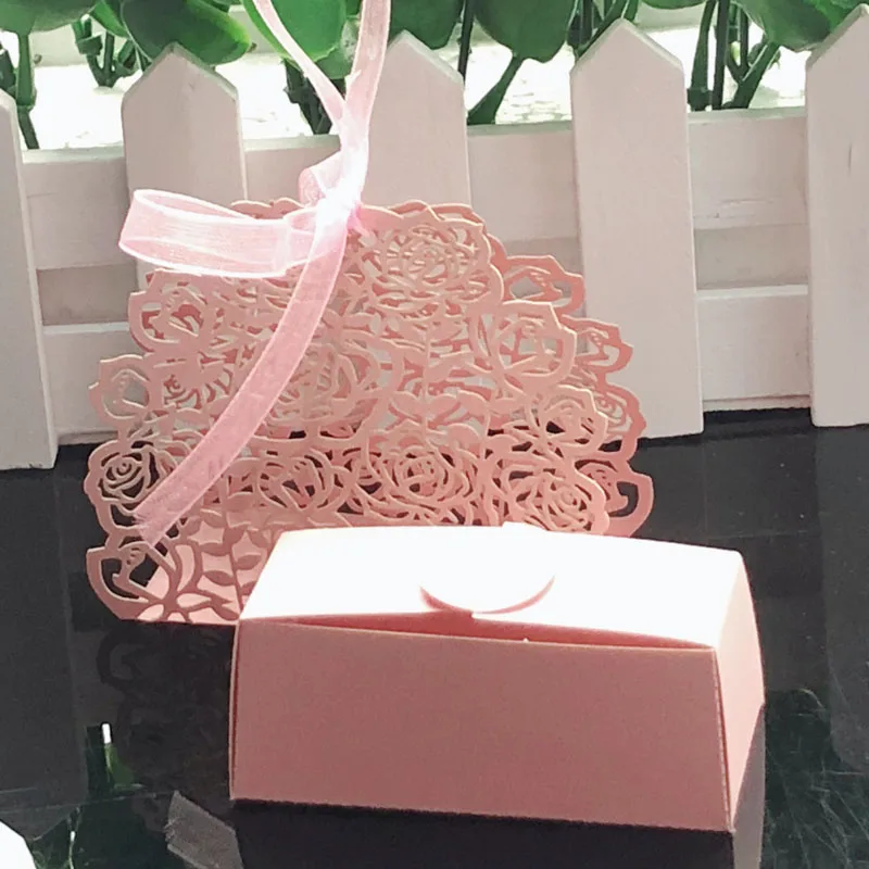50/100 шт Роза и цветок Лазерная резка Конфеты Коробки DIY Полые перевозки подарочные пакеты с лентой Baby Shower свадебный Декор сувениры Вечерние