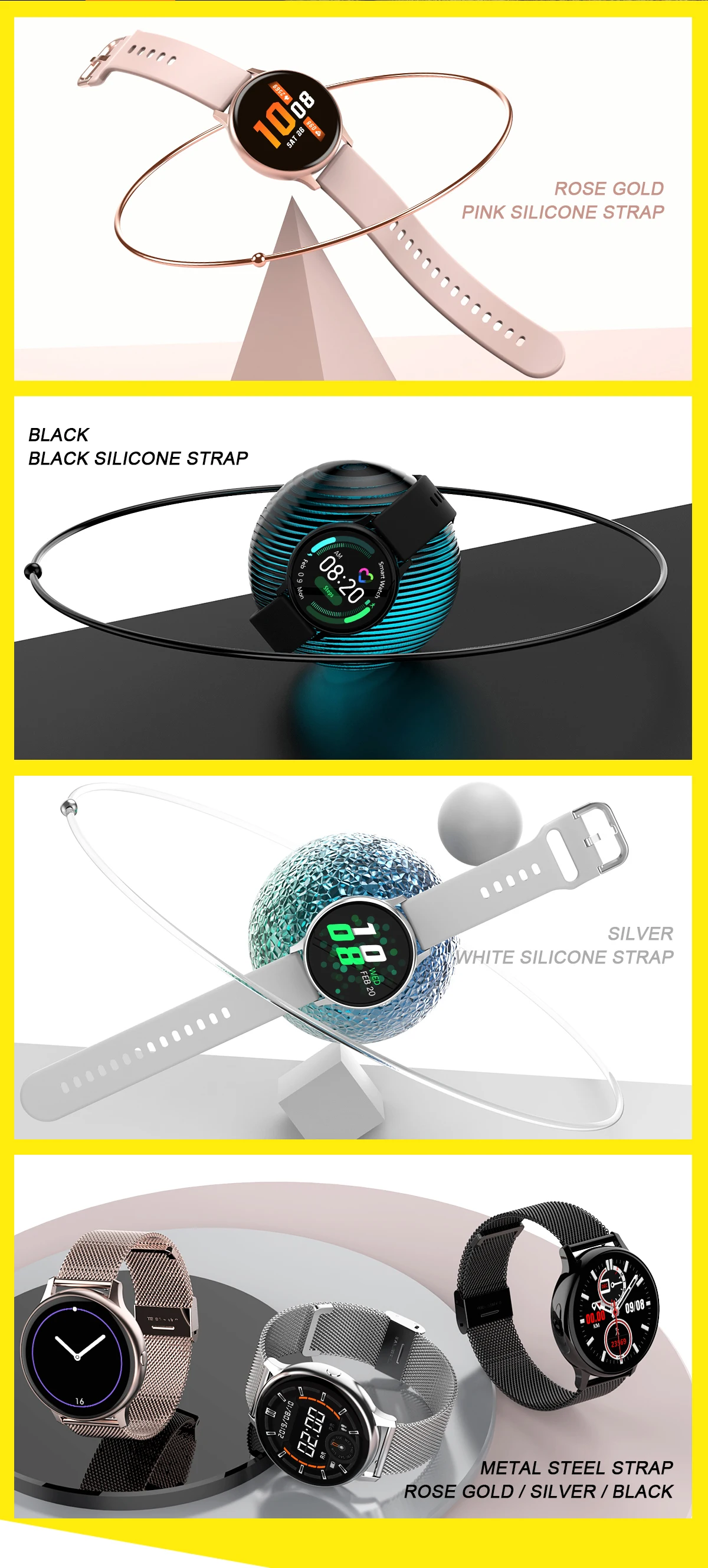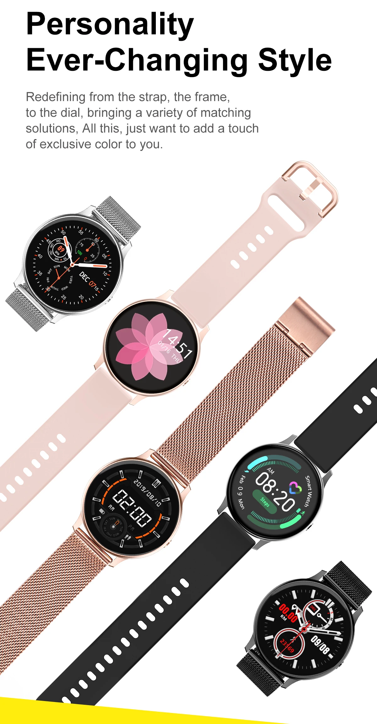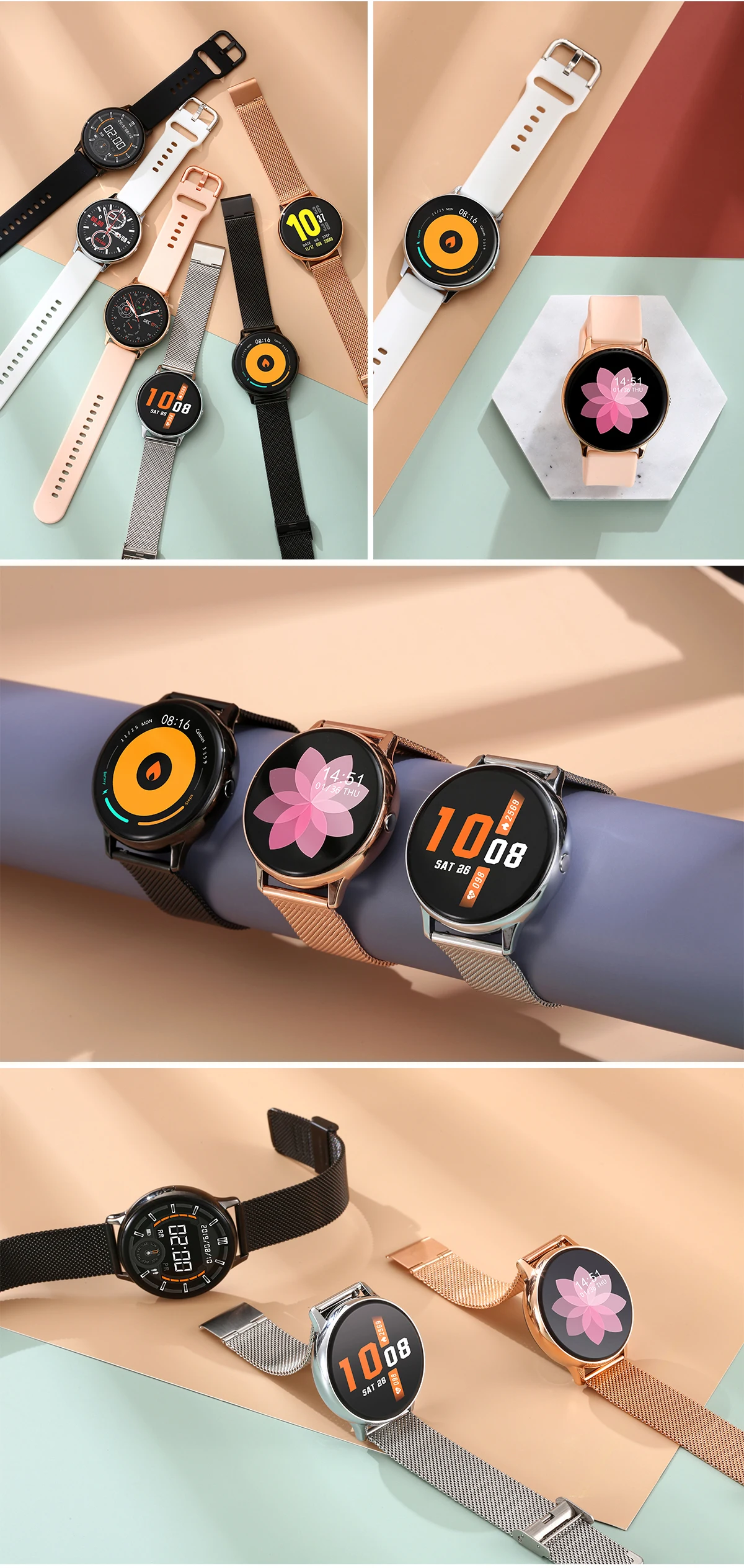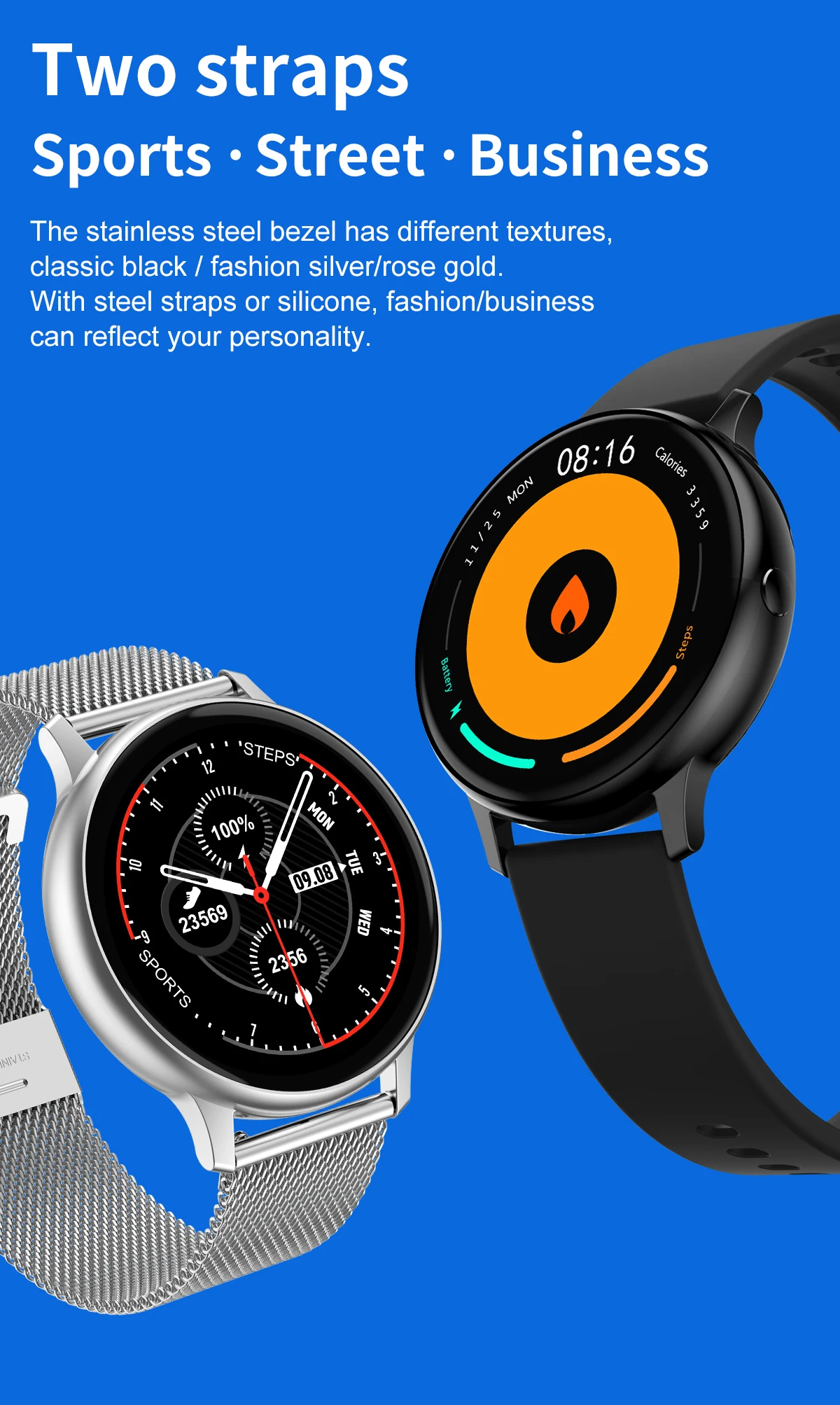 Безель из нержавеющей стали имеет различные текстуры, классический черный/модный серебристый/розовое золото. Со стальными ремешками или силиконом, мода/бизнес может отразить вашу индивидуальность.