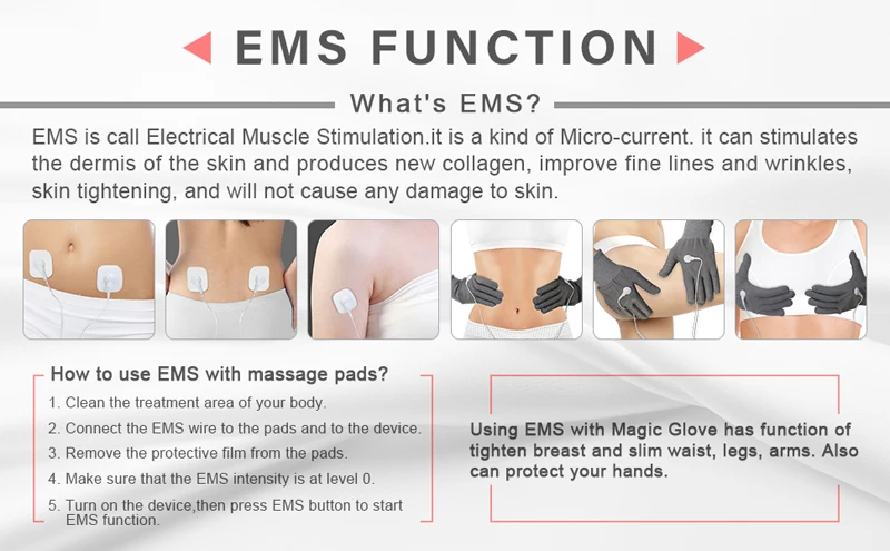 1. Полезно для уменьшения морщин, подтяжки кожи 2. Расслабляет кожу, улучшает кровообращение и улучшает обмен веществ 3. Подходит для массажа лица и лечения тела, чтобы испытать идеальное ощущение для различных типов кожи 4. Физическая Вибрация с 1 МГц может уменьшить жир и эффективно формировать тело 5.EMS реалистично имитировать чувства человеческого тела, такие как постукивание, массаж, разминание, царапины и стройность