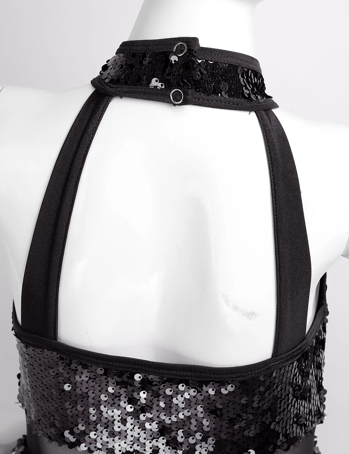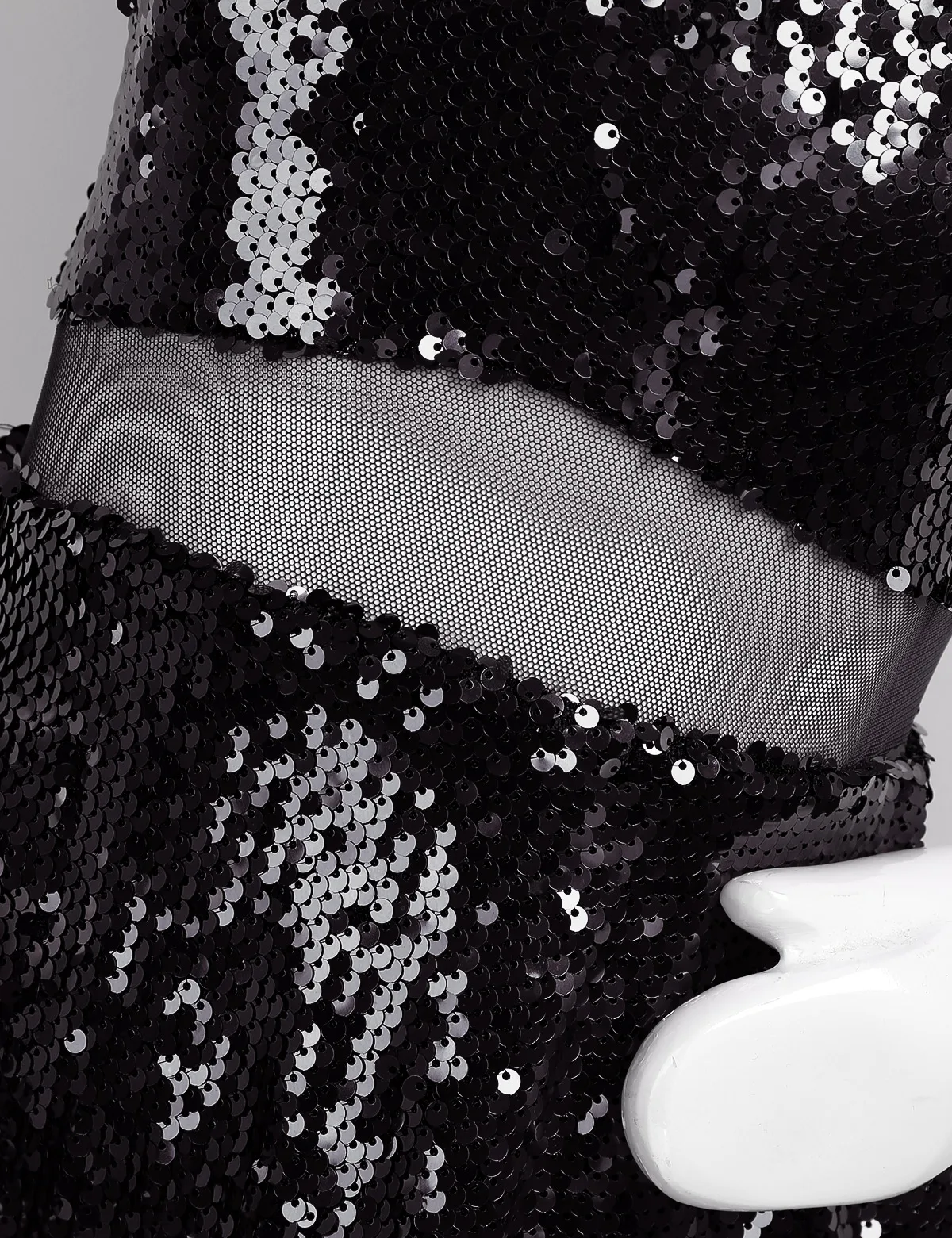 Блестящее платье-трико с блестками, без рукавов, эластичные сетчатые вставки создают иллюзию декольте на шее. Сетчатое соединение на талии. В клетку сзади с застежкой на кнопки.