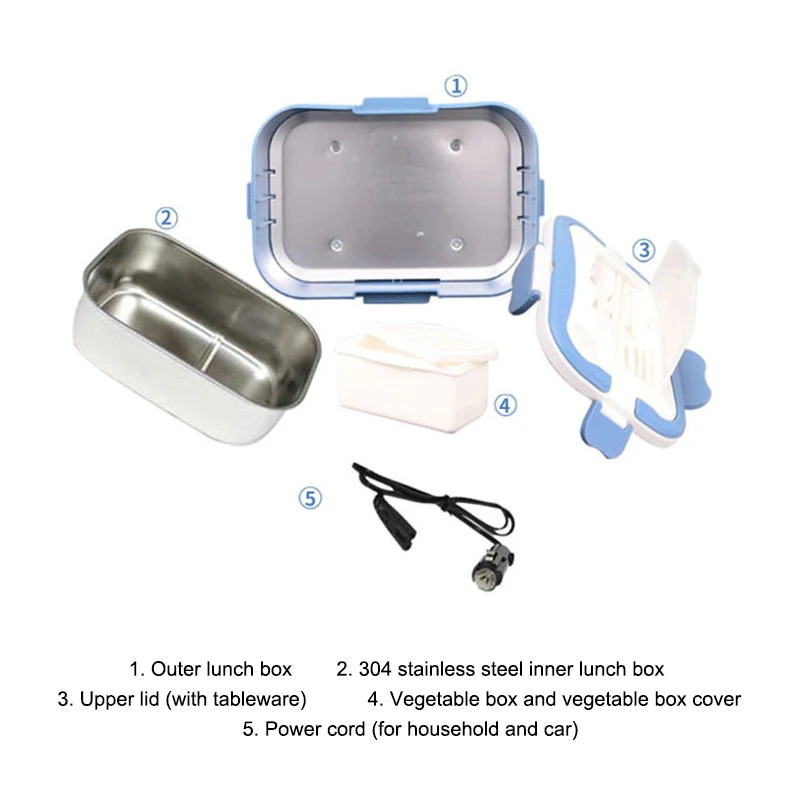 1. Внешняя коробка для завтрака 2. 304 Нержавеющая сталь Внутренний Ланч-бокс 3. Верхняя крышка (с посуды) 4. Vegatable коробка и коробка для овощей 5. Шнур питания (для дома и автомобиля)