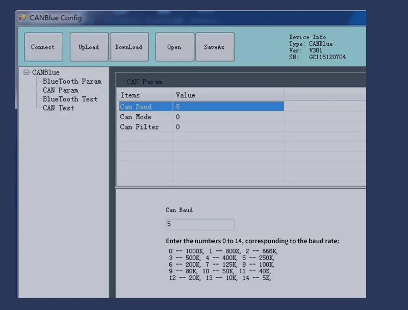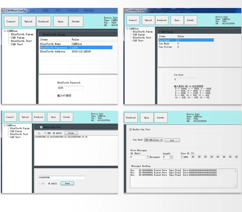 CANBlue конфигурация имеет функцию тестирования CAN-Bus и bluetooth. Тест CAN-Bus принимает и передает данные в двустороннем режиме, он помогает инженерам отлаживать и обнаруживать другие устройства CAN-Bus