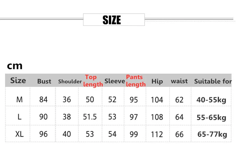 M (см) обхват груди: 84 Длина топа: 50 обхват талии: 62 обхват бедер: 104 Длина брюк: 95 L (см) обхват груди: 90 Длина топа: 51 обхват талии: 64 обхват бедер: 108 Длина брюк: 97 XL (см) обхват груди: 96 Длина топа: 53 обхват талии: 66 обхват бедер: 112 Длина брюк: 99