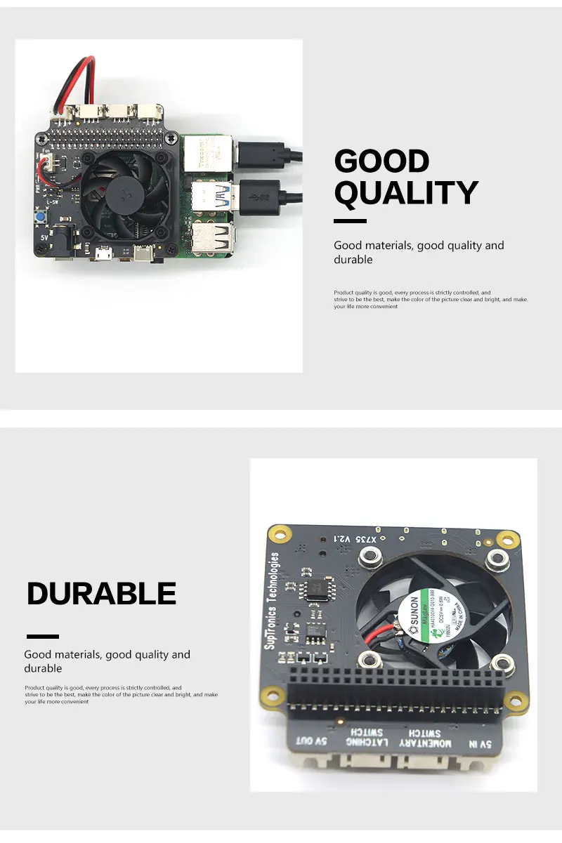 -Интеллектуальное и безопасное управление питанием -Оснащен мгновенным кнопочным переключателем для легкого управления питанием -Нажмите кнопку, чтобы включить -Нажмите кнопку и удерживайте в течение 1-2 секунд для перезагрузки -Нажмите кнопку и удерживайте в течение 3-7 секунд для обеспечения безопасного отключения -Нажмите кнопку и удерживайте в течение> 8 секунд, чтобы отключить работу -Поддержка безопасного отключения и полного отключения через программное обеспечение -Встроенный светодиодный индикатор показывает состояние включения, перезагрузки и выключения питания -Встроенные разъемы PH2.0 позволяют использовать внешний переключатель блокировки или мгновенную кнопку -Обеспечивает питание Raspberry Pi через 40-штыревой разъём-без каких-либо дополнительных кабелей требуется -Интегрированный высокопроизводительный MOSFET выключатель питания позволяет непрерывному сливу тока до 17A -Позволяет вводить мощность через разъем постоянного тока или разъем Type-C или разъем Micro-USB или разъем XH2.54 -Позволяет выходная мощность через XH2.54 резьбой раструбного соединения для или 40-штыревой разъём -Вентилятор охлаждения с регулируемой температурой -Автоматическое управление вентилятором для охлаждения/тихой работы -Температура платы ≤ 34C-вентилятор работает на низкой скорости -Температура платы ≥ 34C-вентилятор работает на средней скорости -Температура платы ≥ 45C-вентилятор работает на полной скорости -Встроенные светодиоды показывают состояние работы вентилятора на низком и высоком уровне -Не требуется драйвер и Дополнительная настройка для охлаждающего вентилятора -Защищены 40-контактный стекируемые Заголовок для надстройку Панели -Работает со всеми текущими моделями Raspberry Pi, используя 40 контактный разъем -Встроенный разъем micro-USB или Type-C для ввода питания-нет необходимости менять адаптер питания -Полностью совместим с X820, X850, X860, X870, X822, X852 для обеспечения интеллектуального и безопасного управления питанием