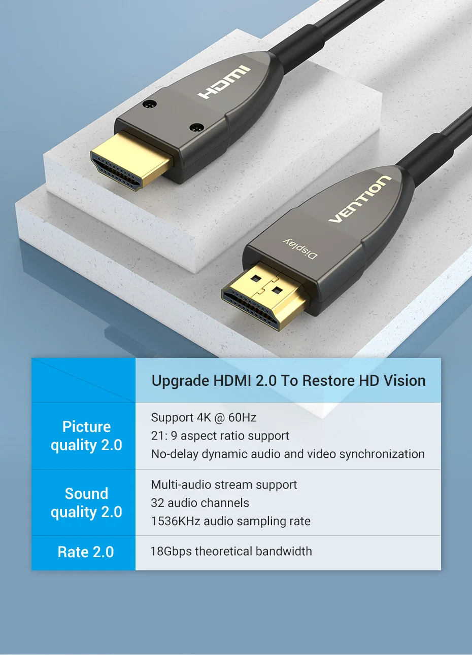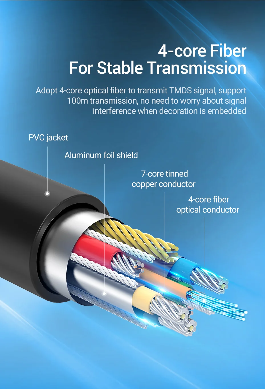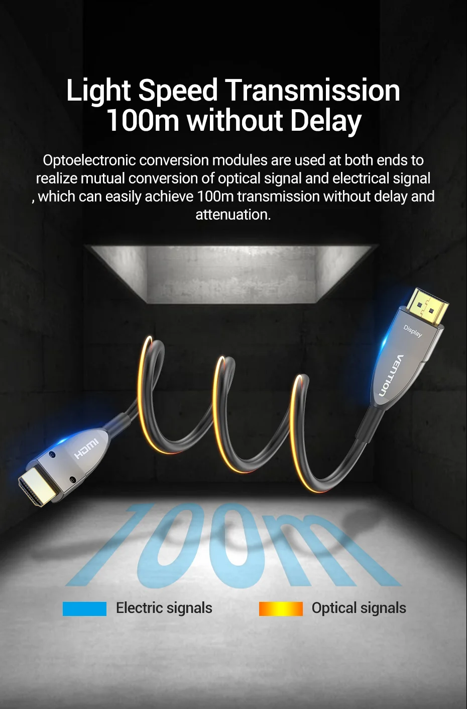 Вопросы и ответы: Вопрос: Есть ли излучение при передаче оптического волокна? A: сам оптический сигнал не имеет излучения, поэтому безопаснее использовать. В: при подключении можно ли подключить два конца По желанию независимо от направления? О: Этот продукт не поддерживает обратную передачу. Перед подключением убедитесь в правильности направления. Вопрос: при использовании кабеля структуры, влияет ли передача на дальние расстояния на сигнал? О: Передача Оптического волокна, большой объем связи, низкое затухание, отсутствие давления при 100 м передаче. Вопрос: Является ли кабель HDMI из оптического волокна очень хрупким? Нужно ли вам быть внимательным при использовании? О: испытанный Vention Lab, этот продукт может выдерживать радиус изгиба около 46 мм и угол изгиба 60 °, который не влияет на передачу сигнала и может быть использован с уверенностью.